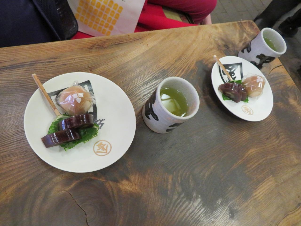 にっぽん丸の乗船客は甘味処「灸まん本舗石段や」で和菓子とお茶の接待。