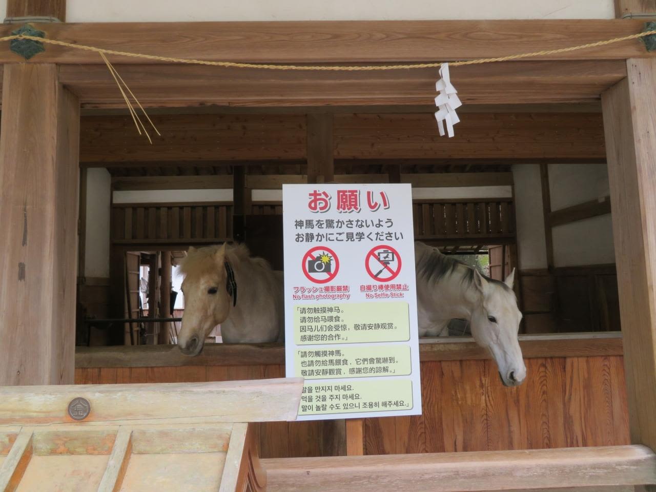 神さまにご奉仕する大切な馬なのでフラッシュ撮影したり触ったり食べ物を与えないようにと注意書き。