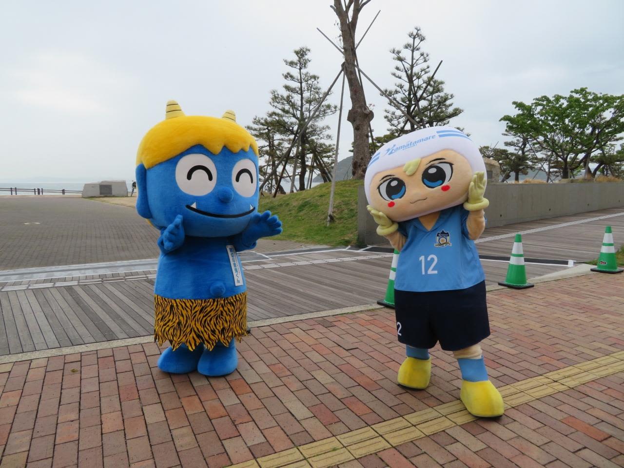 香川県観光PRマスコット『親切な青鬼くん』とカマタマーレ讃岐マスコットの『さぬぴー』が歓迎のお出迎え
