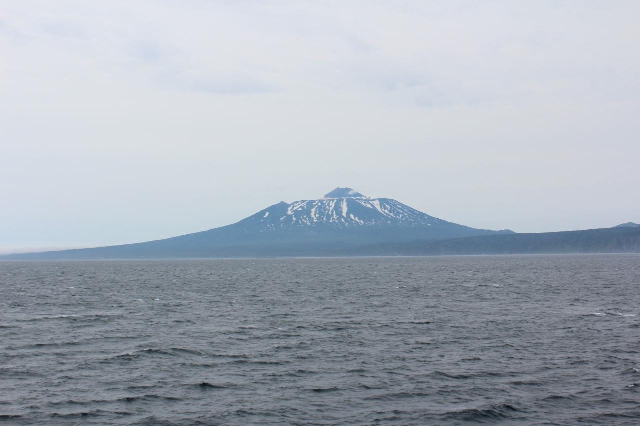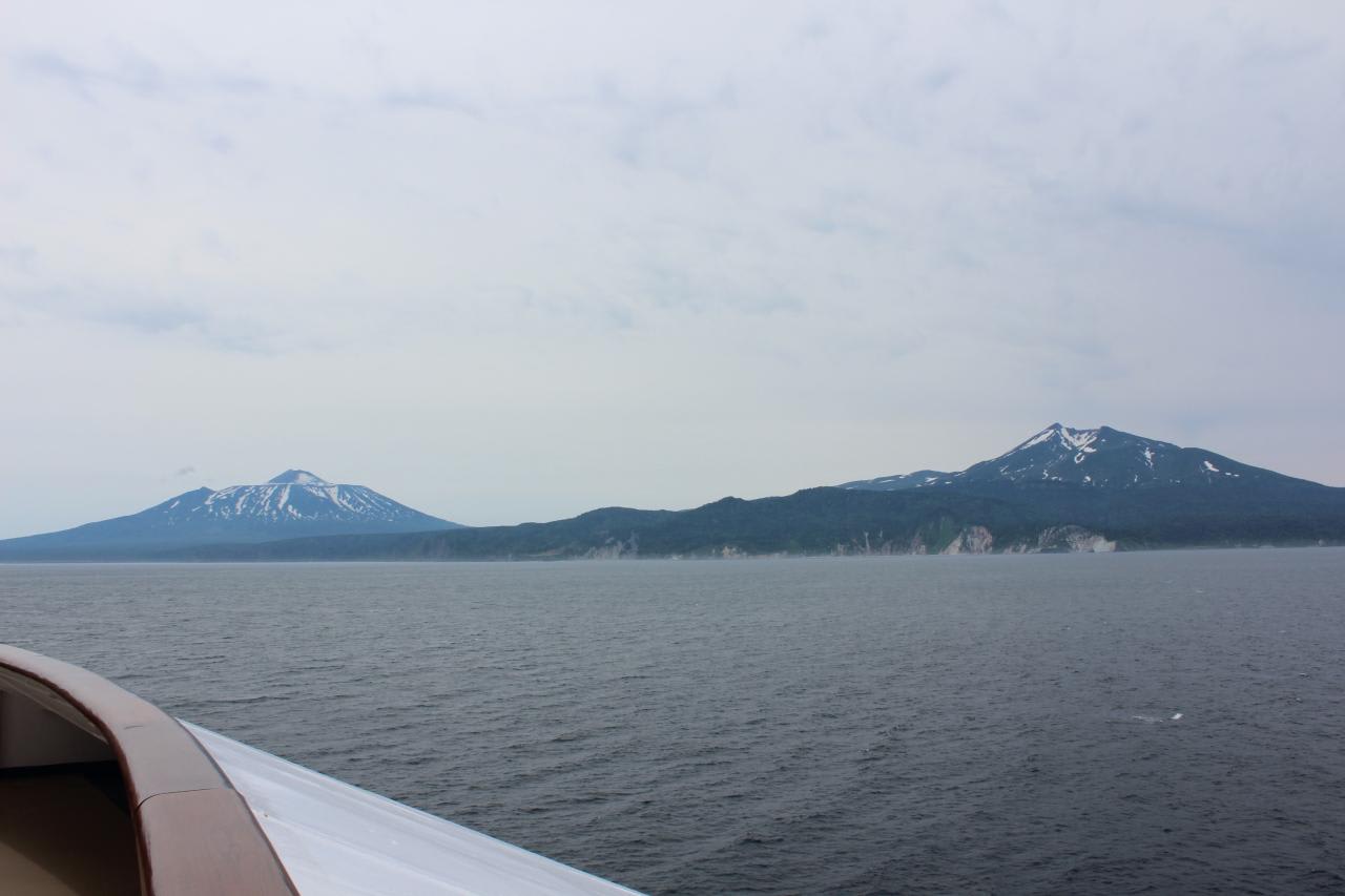 釧路を出港した翌朝、目が覚めたら船は多楽島と色丹島の間の色丹水道を航行。日本最東端の納沙布岬は訪れた事がありますが、納沙布岬よりも更に東に50キロのロシア海域の色丹水道に自分がいる事に感激しました。あいにく曇天で視界不良であったが、国後島に近づくにつれて視界良好となり、富士山の上に槍ヶ岳をのせたような形の爺爺岳とルルイ岳が見えた時は感動しました。国後島東部を左回りに半周し、いよいよ知床半島に近づいた時には再び霧で視界不良となりました。知床半島を周遊するというのに何も見えないかと諦めかけていたら、知床岬を通過した辺りから我々の願いが叶い、知床半島が目の前に見えてきました。左舷側に知床半島を眺めながら沿岸から1.5キロの沖合をゆっくりと航行したため、肉眼でも滝や集落が確認できた。双眼鏡や望遠レンズを使い、知床岳・硫黄山・羅臼岳などの山並みを眺め、今回のハイライトである知床半島を周遊し、クルーズならではの醍醐味を堪能しました。