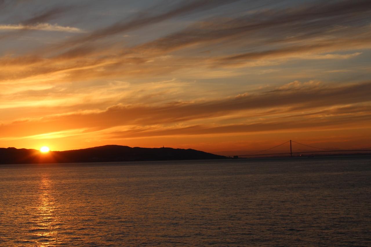 デッキから眺める淡路島に沈む太陽と明石海峡大橋