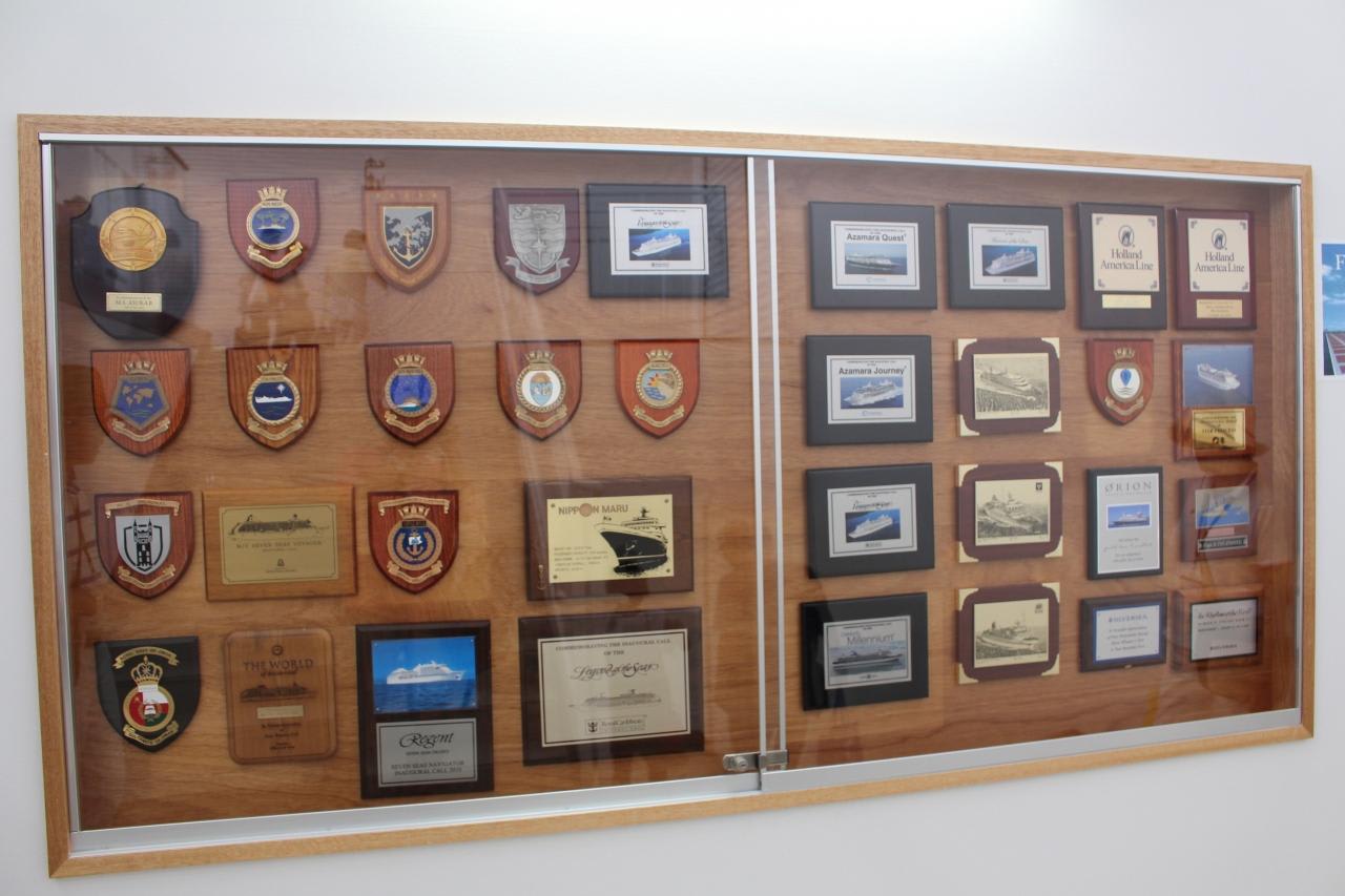 旅客ターミナルに掲出の来港した数々の客船の記念楯。来港した客船のズラリと並んだ記念楯は珍しい。