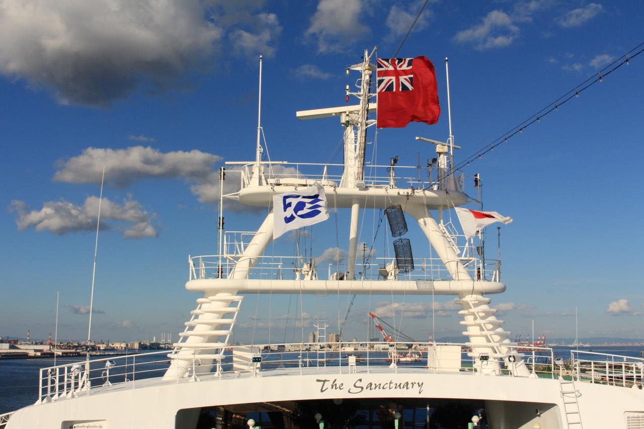 ダイヤモンド・プリンセスは神戸を夕方5時に出港。曇天から出港前には快晴となり、英国国旗・日本国旗・社旗が軽やかに棚引く。