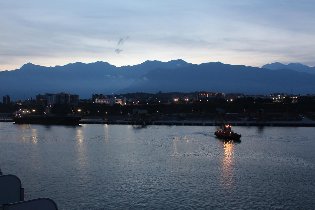 デッキから眺める花蓮の夕暮れ。ダイヤモンド・プリンセスは次の寄港地・高雄へ