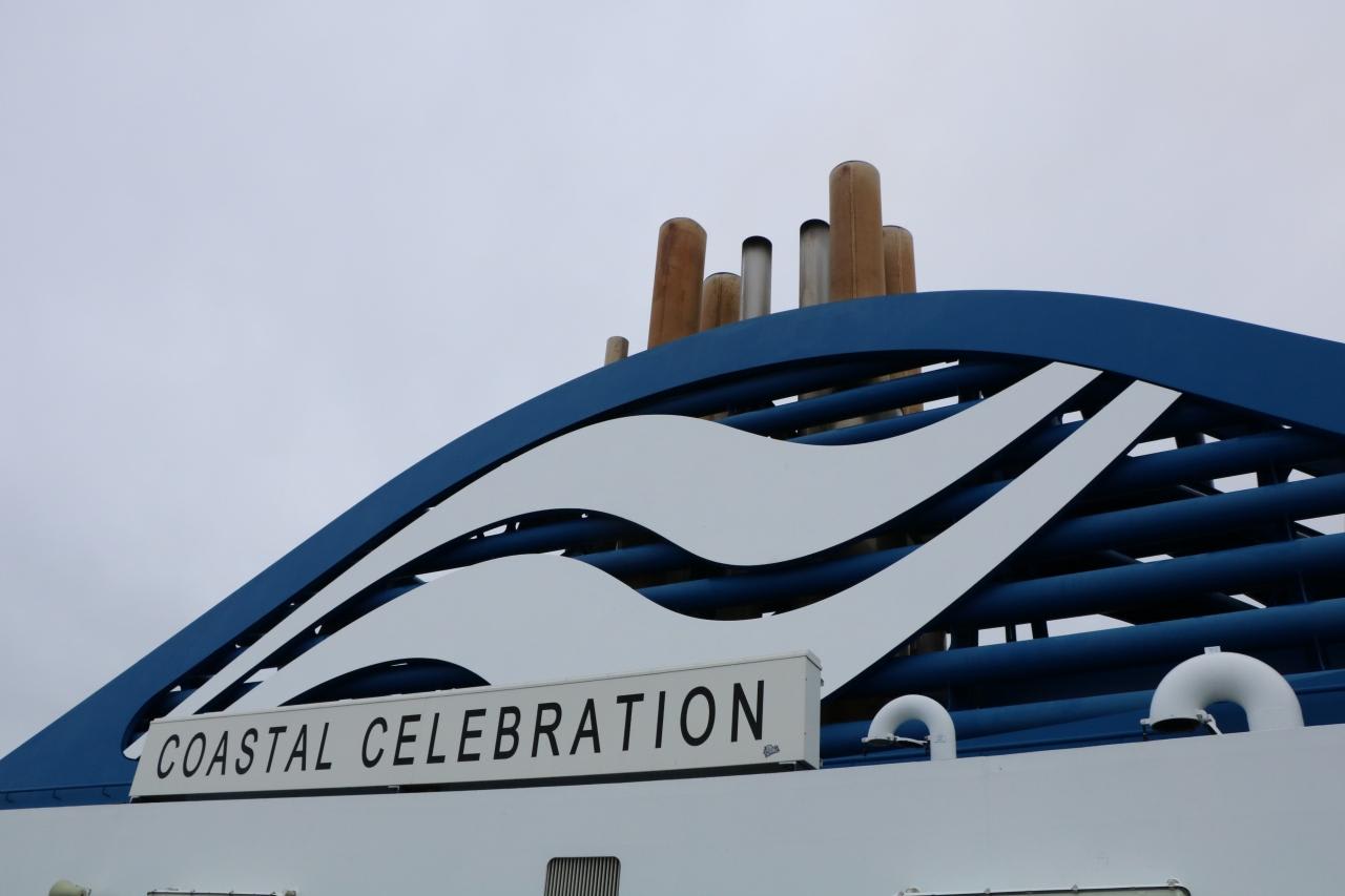乗船したCOASTAL CELEBRATIONのファンネル。<シップデータ>2008年ドイツの造船所で建造、総トン数10000トン、全長160メートル、乗客・船員定員1604名同型船:Coastal Inspiration