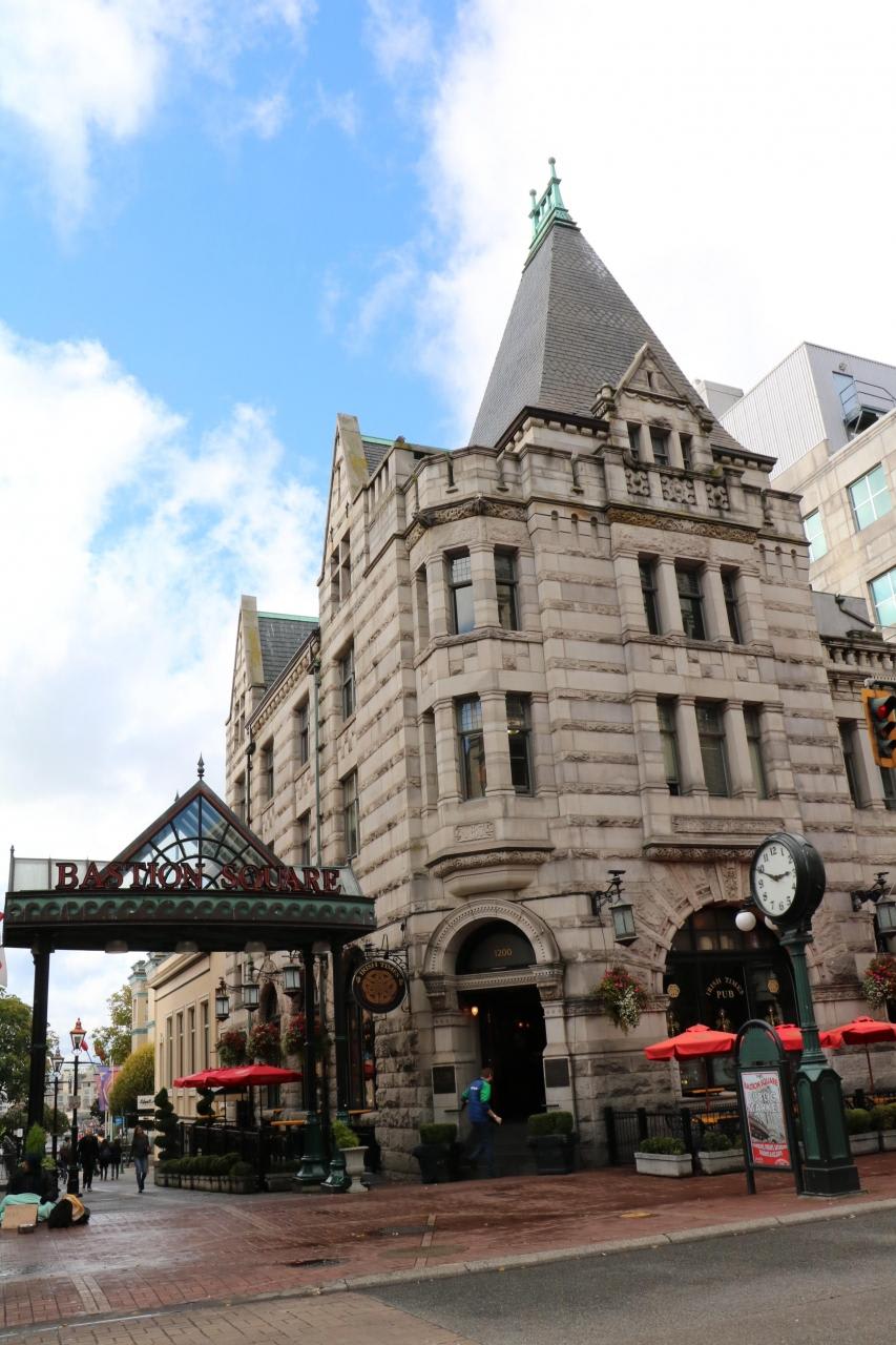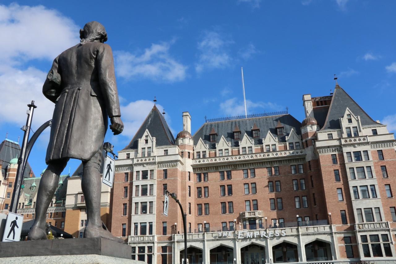 南に州議事堂、西にインナーハーバーを見下ろす好立地に建つ最高級ホテルのフェアモント・エンプレス。イギリス様式の優雅な外観に見惚れる。銅像はイギリス海軍士官「ジェームスクック」。