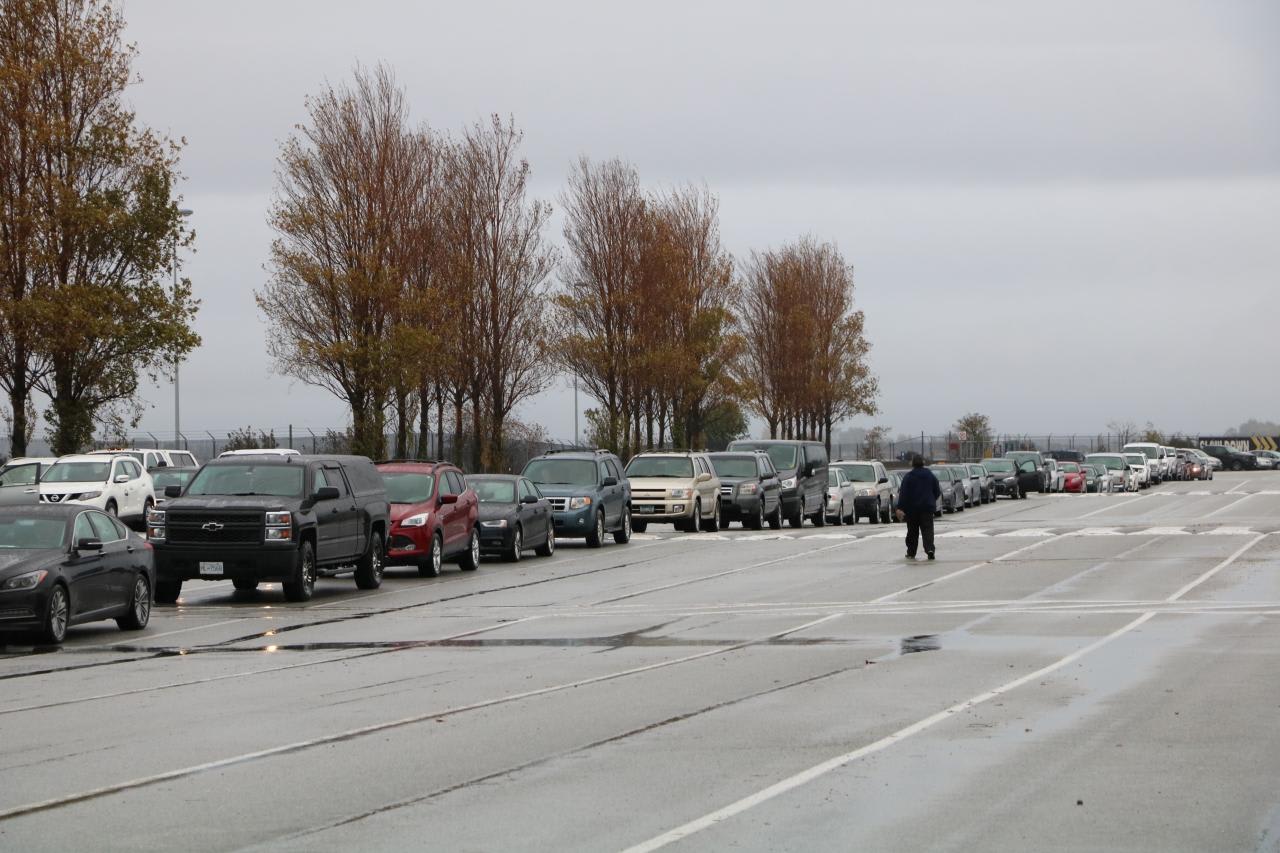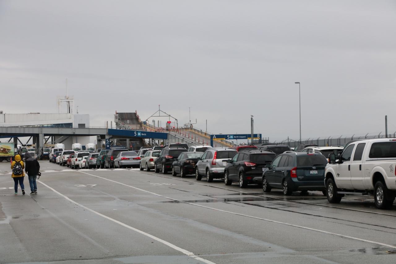 バンクーバー南部のトウワッサン港で乗船を待つ自動車。長蛇の列を見てバンクーバーとビクトリアを結ぶ生活に密着した重要な航路である事を実感。