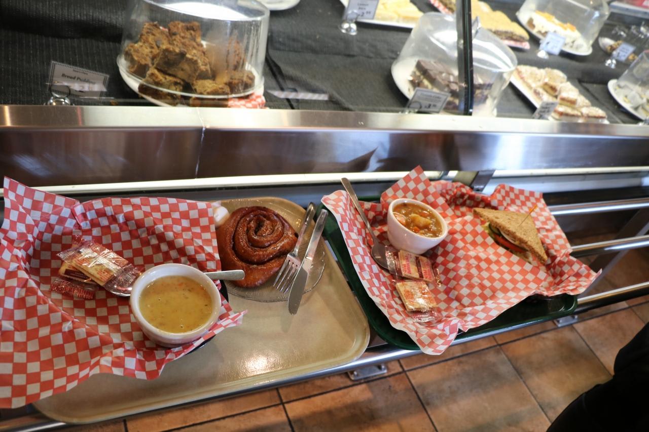 ランチは名物デリ「Sam's Deli」。シナモンロールとサンドイッチと温かいクラムチャウダー