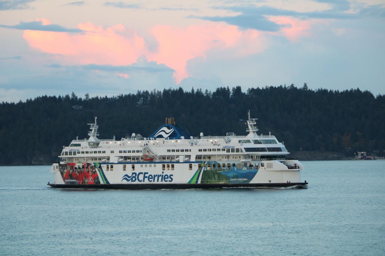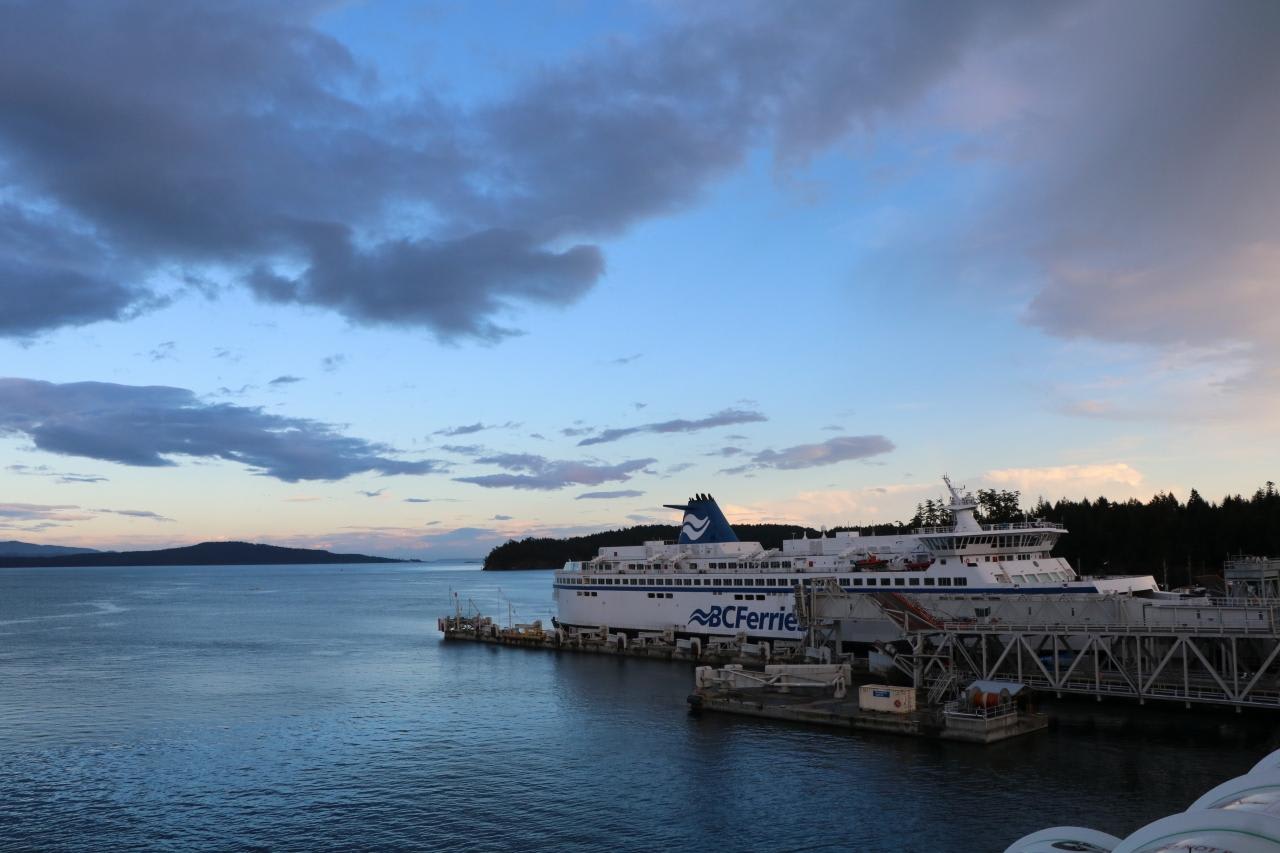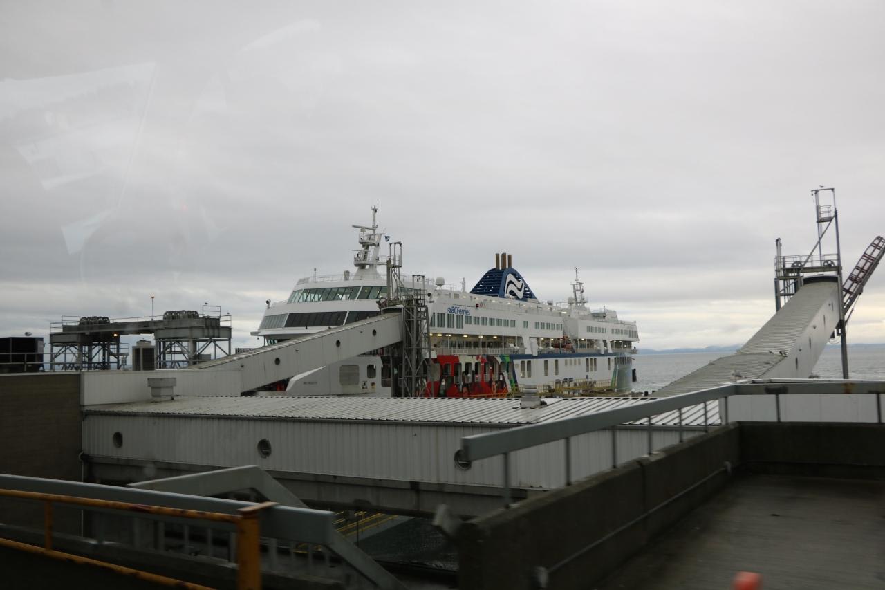 これから乗るB.C.フェリー。(B.C.はブリティッシュ・コロンビアの略)バンクーバー南部のトウワッサン港とビクトリア北部のスワーツ・ベイ港を結ぶ。途中、アメリカの領海も通過します。