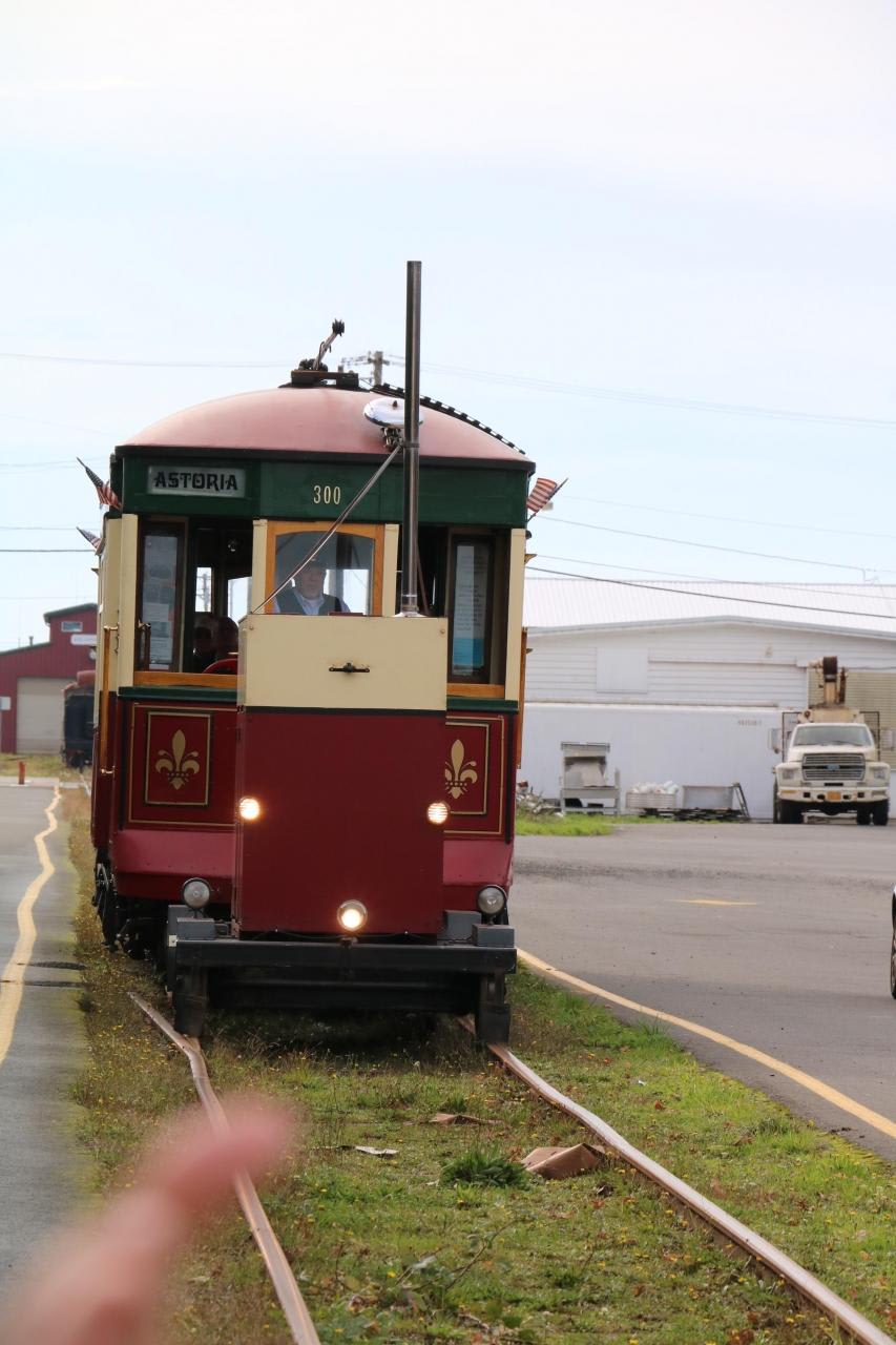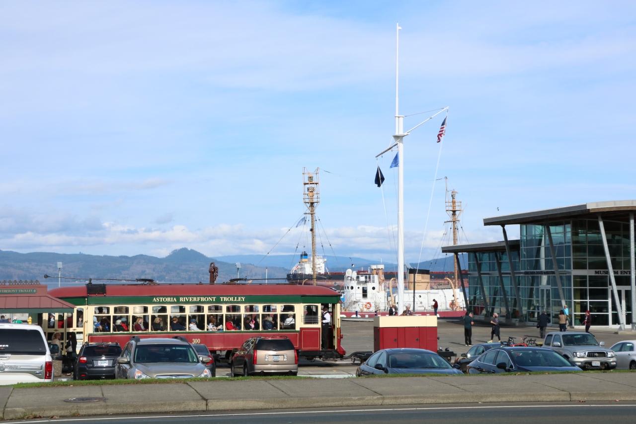 コロンビア川海事博物館の前を颯爽と通過中のアストリア・リバーフロントトロリー