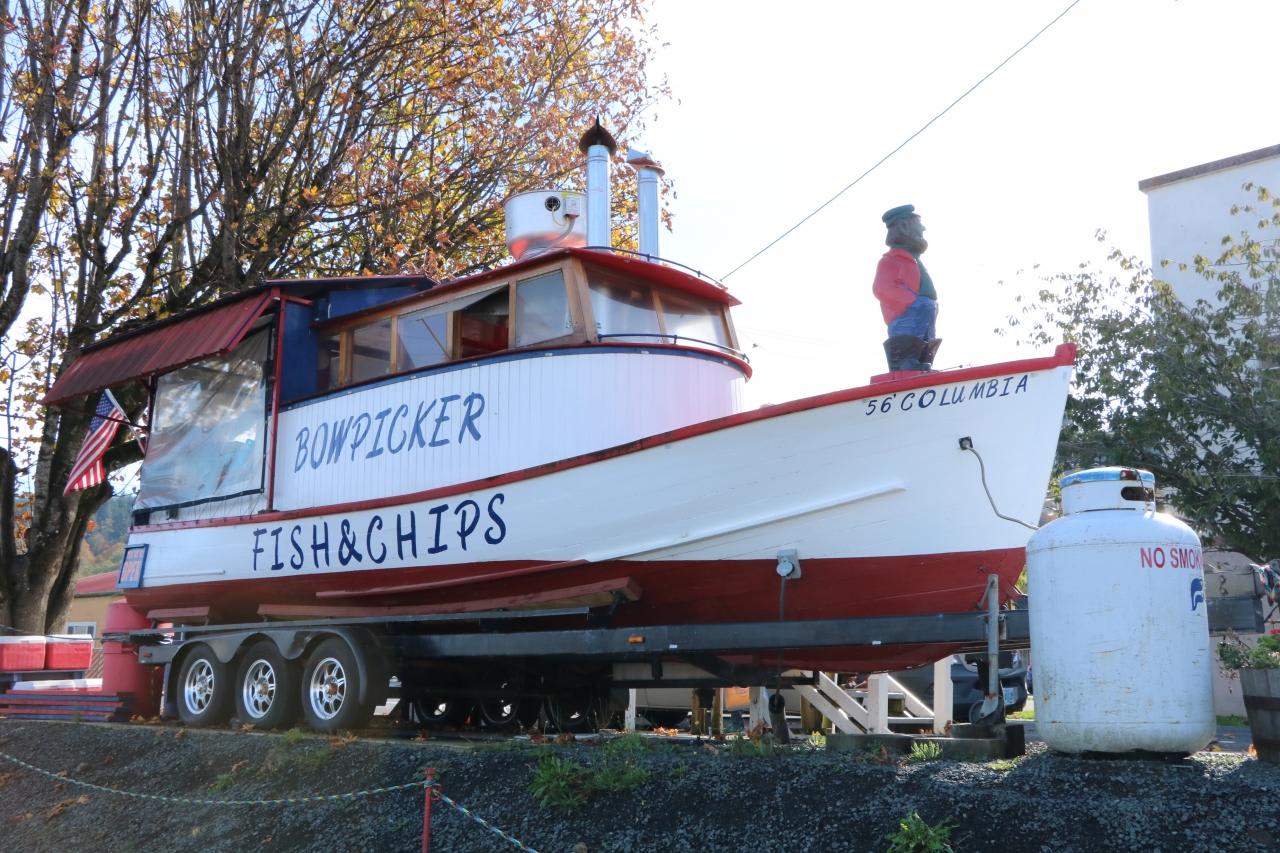 BOWPICKER FISH&CHIPSを 横から撮影。車輪の上にボートが置かれ、ユニークな造りでした。