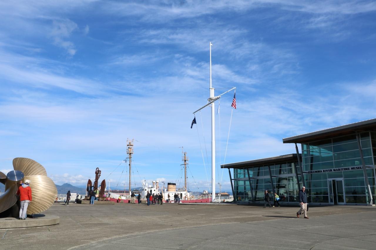 コロンビア川海事博物館の正面玄関風景コロンビア川を実際に航行していたフィッシングボートや沿岸警備船が展示され、コロンビア川がもたらした町の発展や歴史などが分かります。