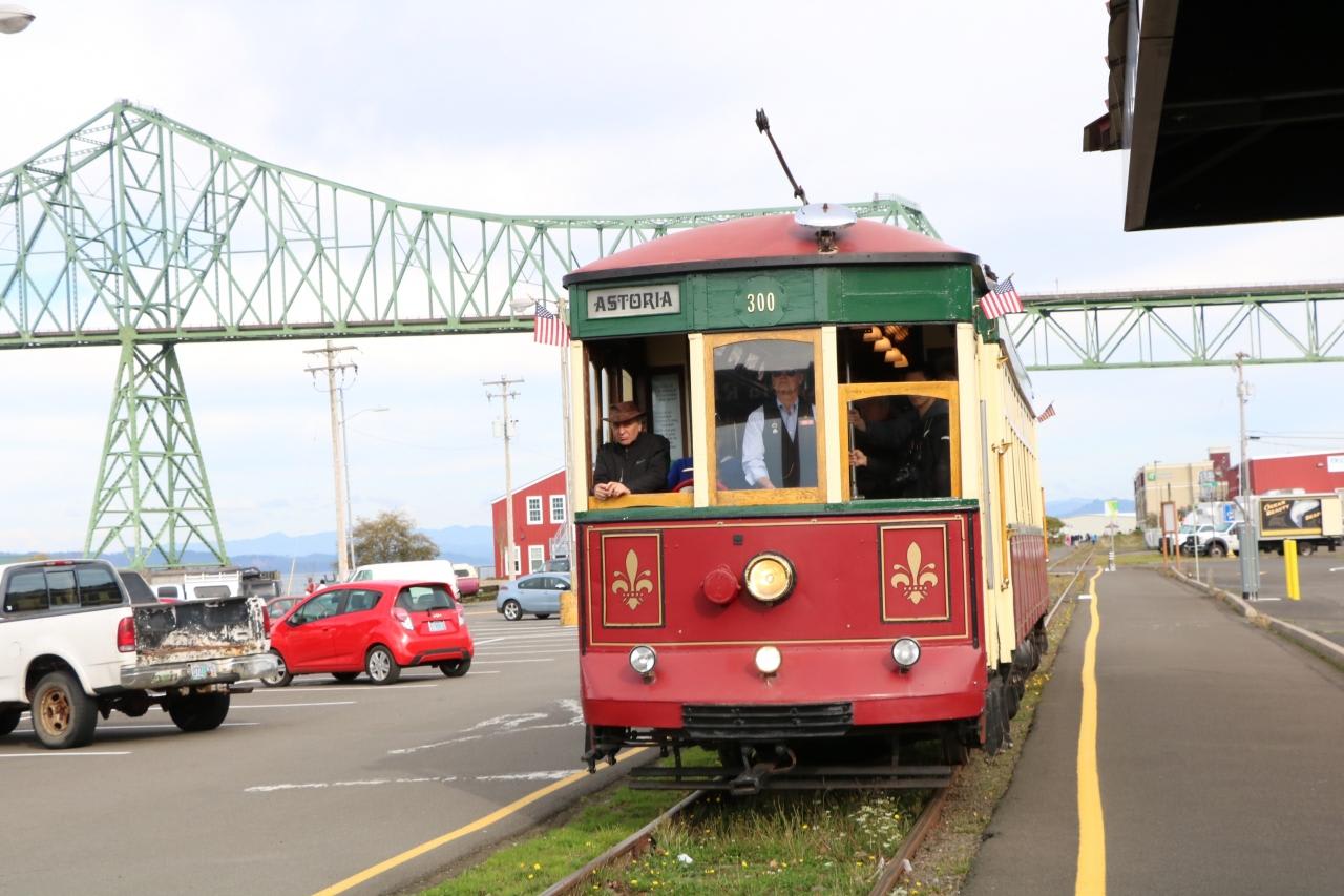 アストリア・メグラー橋を潜り抜けるアストリア名物のアストリア・リバーフロントトロリー。1914年製造のトロリー(路面電車)を復元し、コロンビア川沿い東西4.8kmを運行。貿易と林業で栄え、コロンビア川でサケ漁が盛んだったらしく、残されたサケを運ぶトロッコの軌道に観光用のトロリーを走らせている。