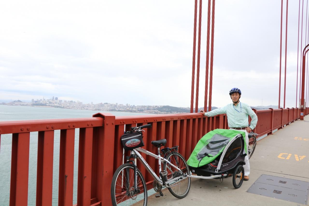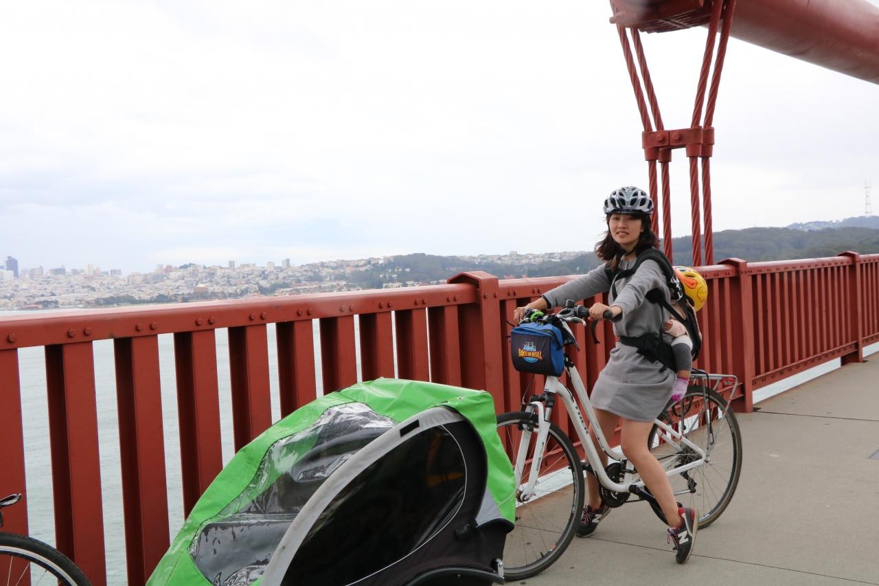 次の観光目的地は1937年に完成したゴールデン・ゲート・ブリッジ。旅行ガイド本お勧めの「海沿いをサイクリング」というキャッチフレーズに惹かれ、レンタサイクルでゴールデン・ゲート・ブリッジを渡りました。レンタサイクル屋で「ベビーは中で寝られるからcomfortable」と勧められたトレーラー付き自転車は途中でブレーキが故障し動作不良となり、ゴールデンゲートブリッジを渡るのは難行苦行でした。行程は約15キロ。