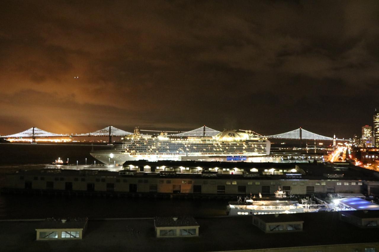 スター・プリンセスのデッキから眺めたベイブリッジとルビー・プリンセスの夜景。ルビー・プリンセスは夏場はアラスカ、秋から春にかけてはメキシコやカリブ海クルーズを運航。