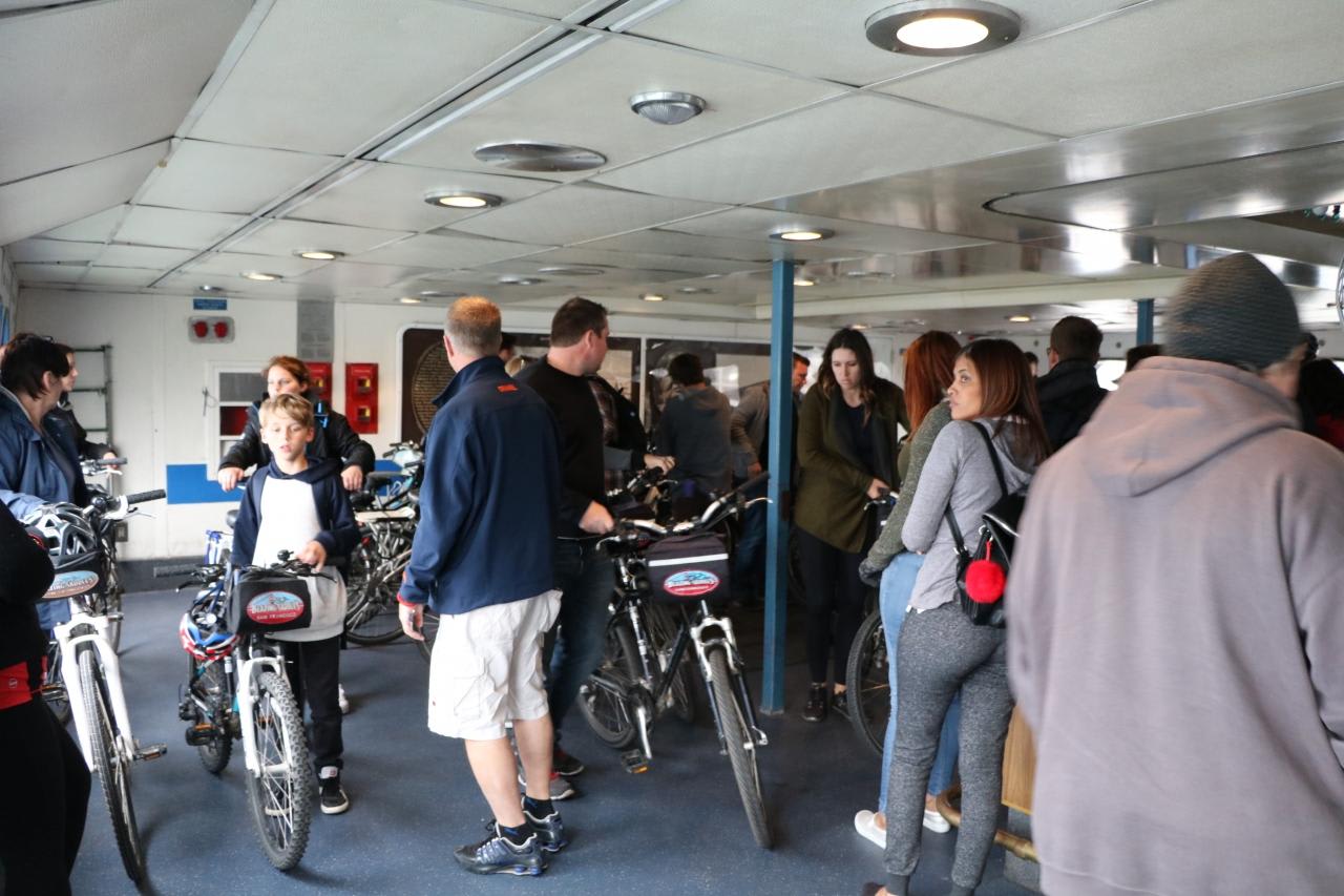 フェリーは殆どが自転車持ち込みの乗船客。降りる時はトレーラー付きの自転車を引きずりながら階段を上らなくてはならず大変でした。