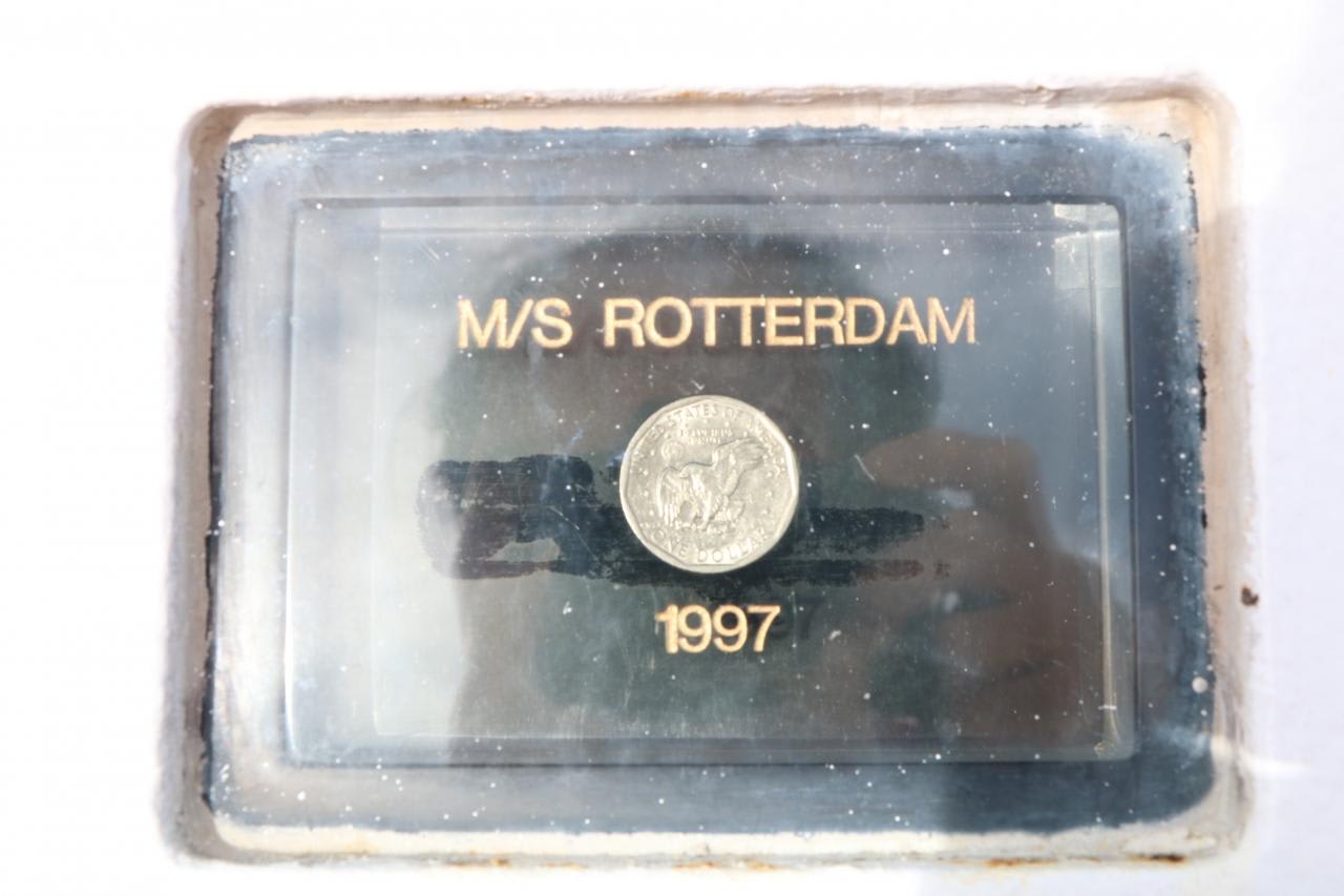 乗船客が上がれる最上階デッキ前方部分に設置の1$硬貨入り銘板何のために設置されているか気になり、通りかかったアメリカ人に尋ねたら,1ドル硬貨はシルバー・ダラー、ゴールデン・ダラーと呼ばれており、多分「GOOD LUCK」の意味があるのではないかと教えてくれた。帰国してから調べてみたら昔ながらの伝統に則り、稀少なコインを船体に溶接して幸運を祈るものである事がわかり、船上での理解は正しかった。