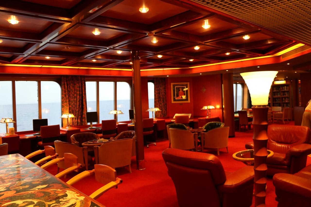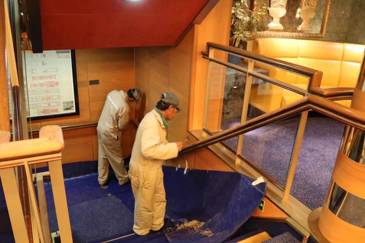 配置転換中のクルーズだけに航海中、階段手摺りのニス塗り作業などの修繕作業が行われていた。1997年建造で就航後20年になるも整備が行き届いており、古さは感じられず重厚感が漂っていた。
