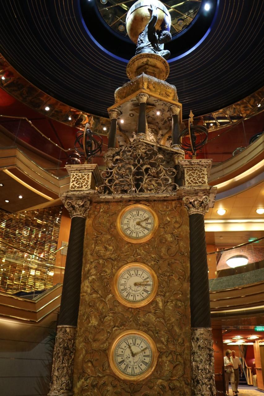 3層吹き抜けのアトリウム。世界各国都市の時間が示されているが、残念なことに指針が正確に標示されていない。