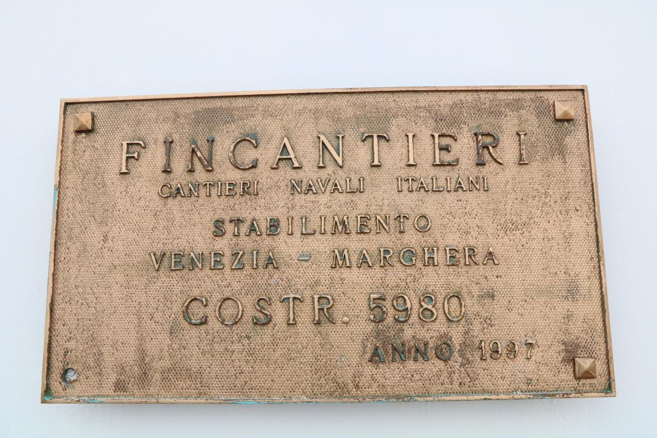1997年にイタリアのフィンカンティリ造船所で示す銘板。乗船した外国客船の殆どがフィンカンティリ造船所で造られており実力が計り知れる。