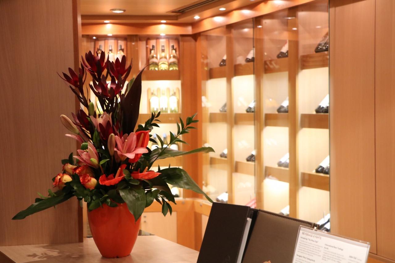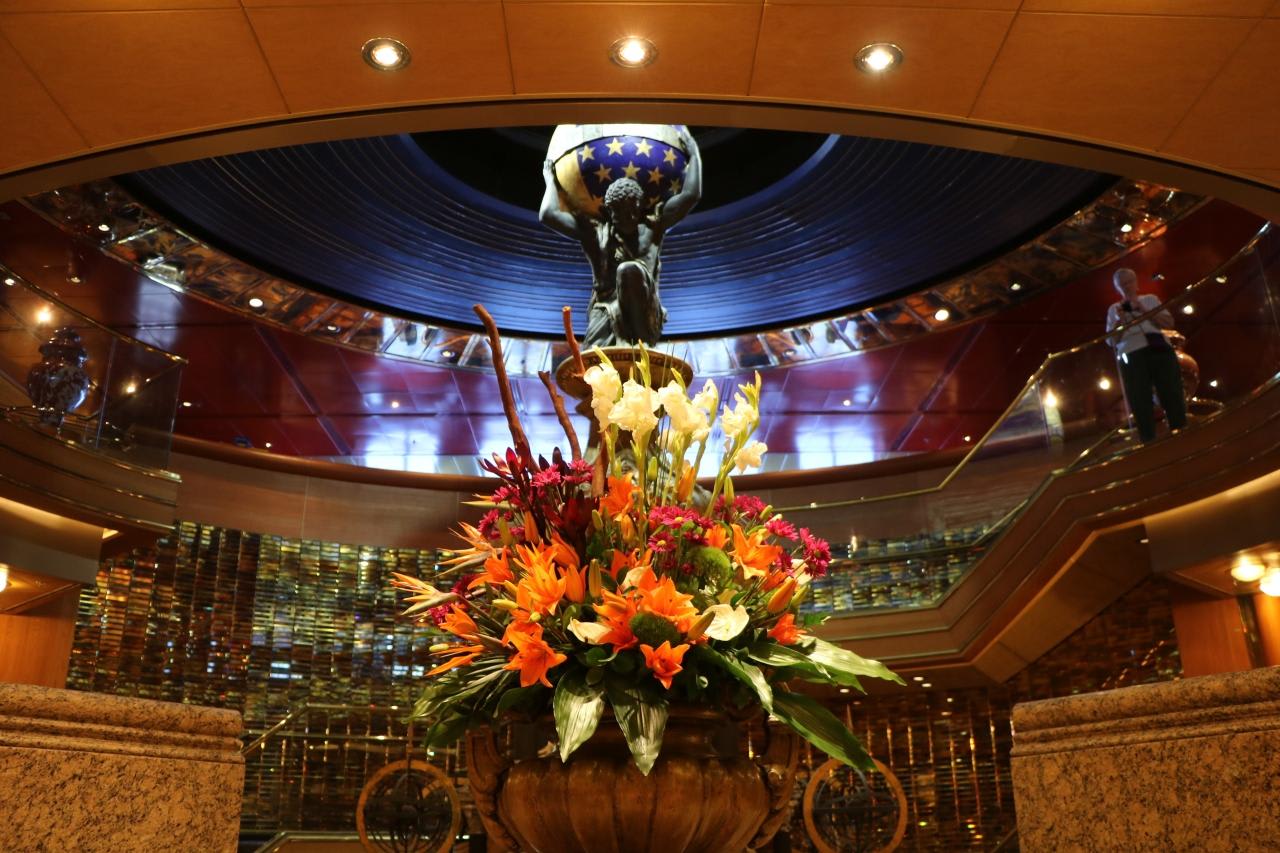 5階レストラン入口の花船内には造花は一切なく全て生花。船上で栽培しているのかと質問したら、全ての花はフォートローダーデールで積み込んだの事。
