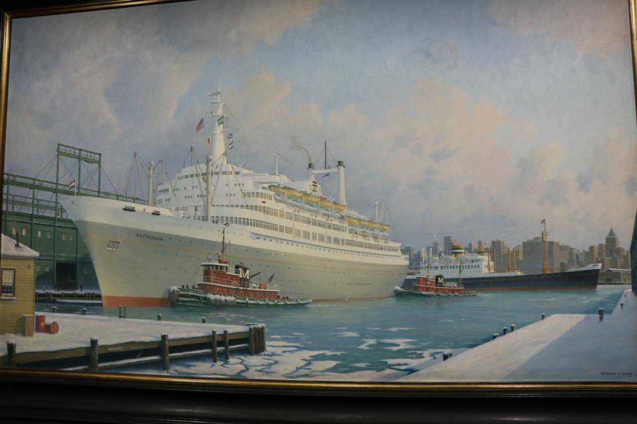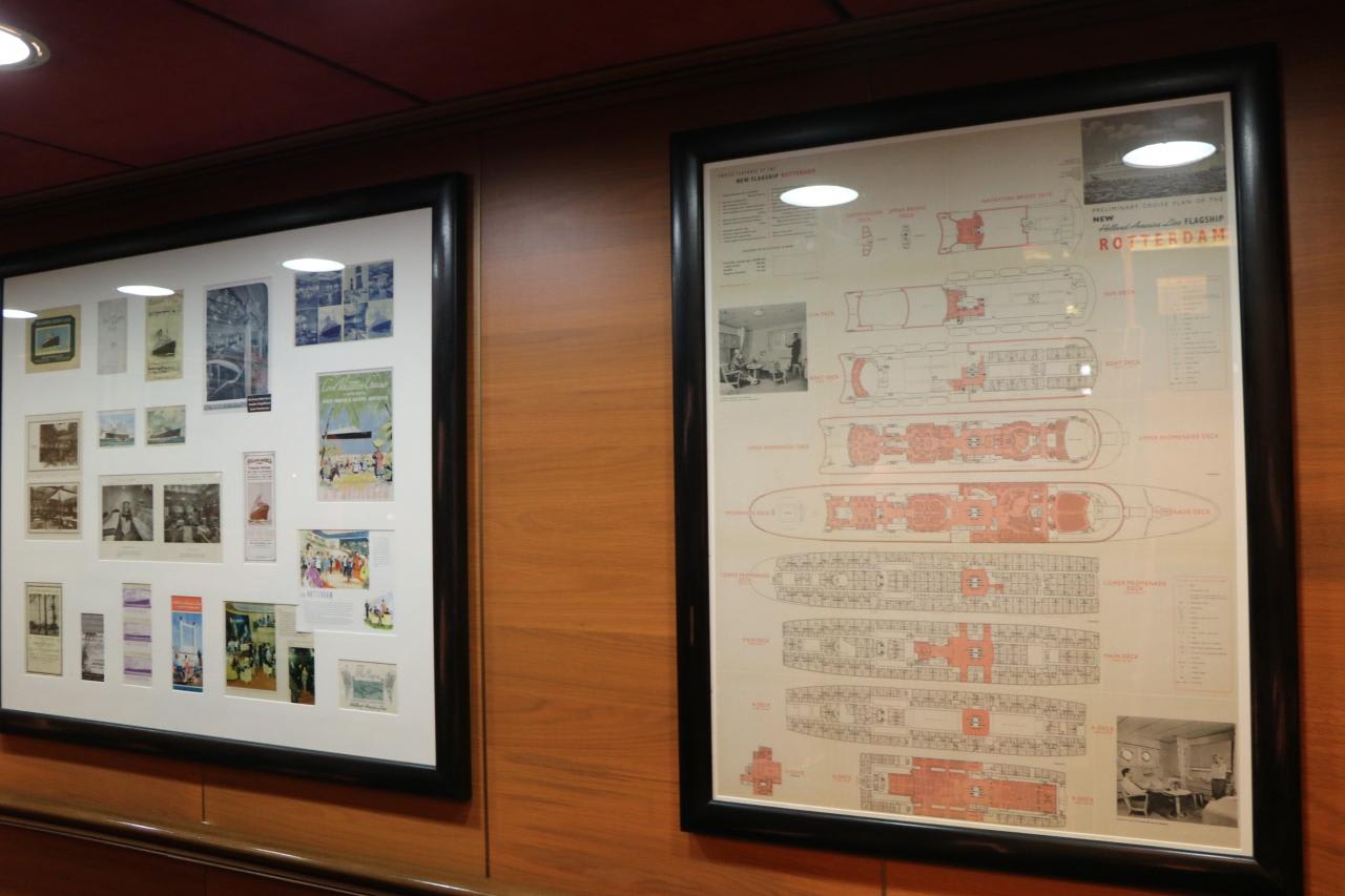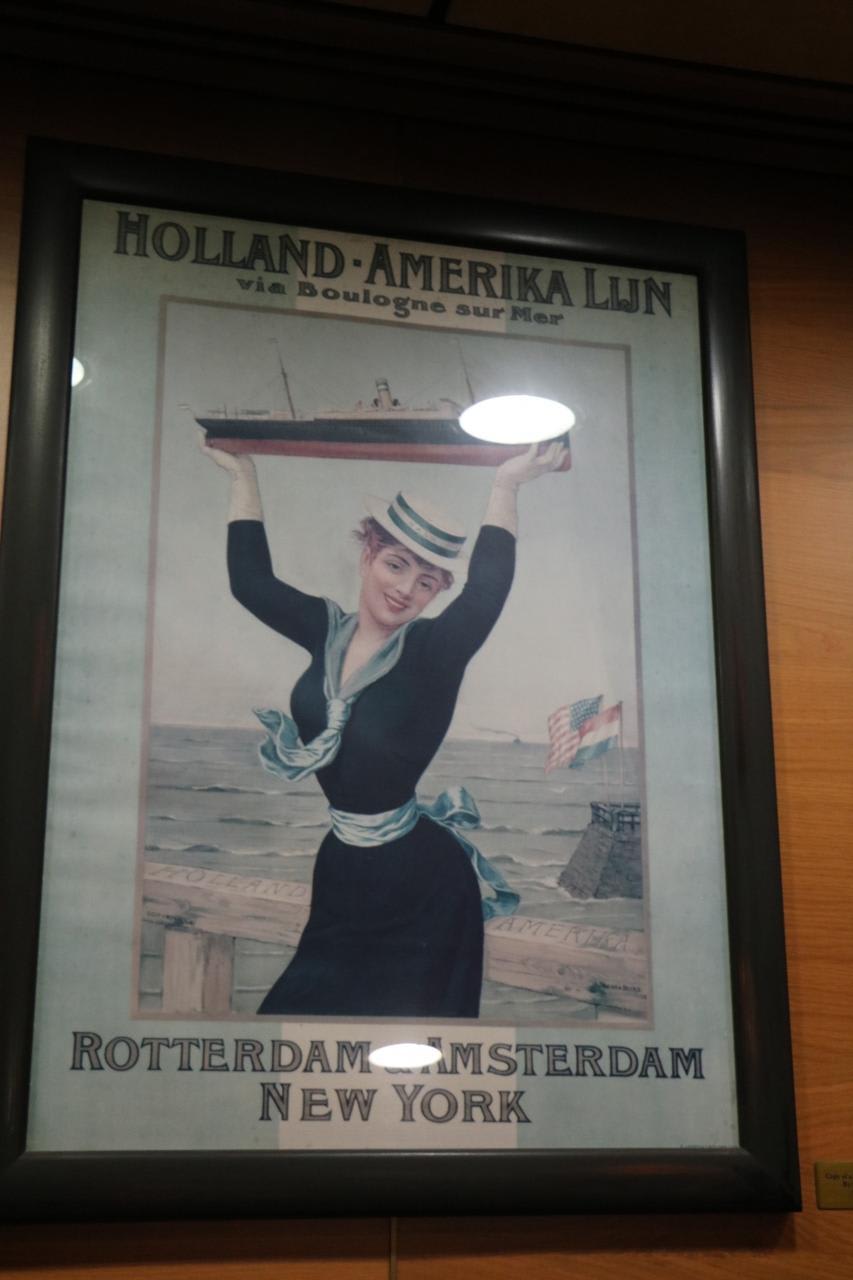 船首側の階段踊り場には写真やポスターが掲示されている。初代ロッテルダム1873年~1883年運航、全長81.8m、総トン数1694トン