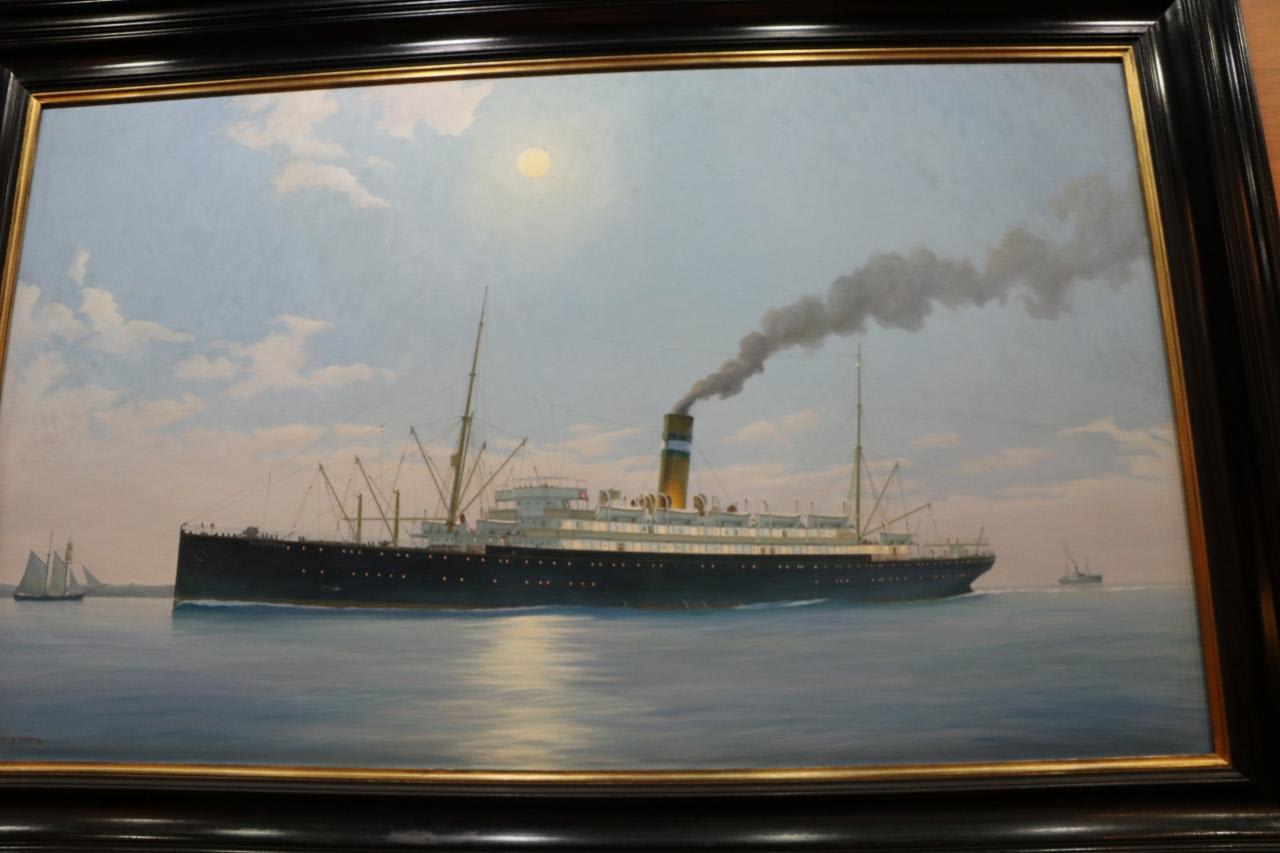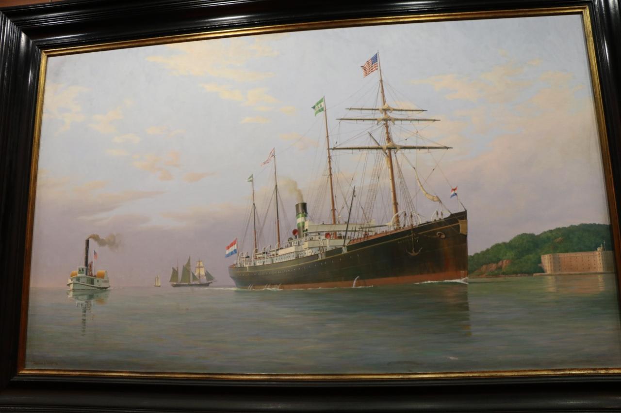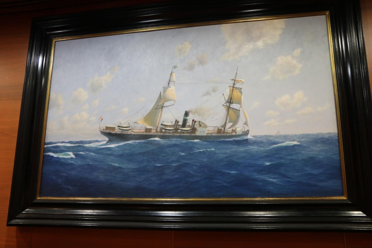 船首側の階段踊り場には写真やポスターが掲示されている。初代ロッテルダム1873年~1883年運航、全長81.8m、総トン数1694トン