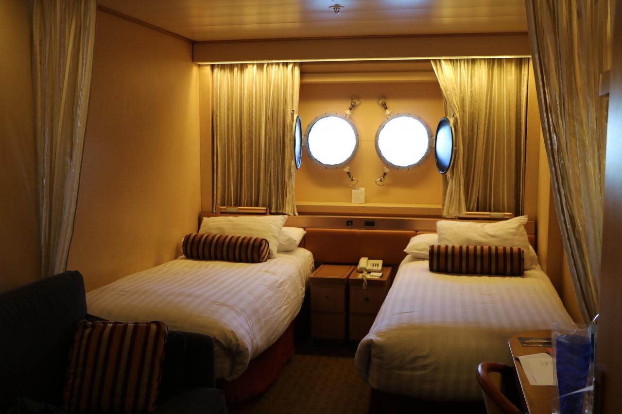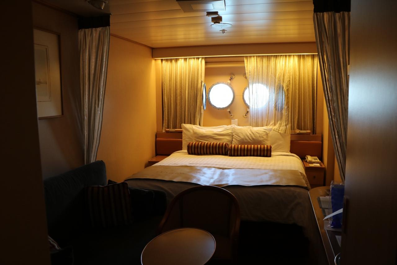 当初は一人旅で計画し、料金の安い内側客室で検討したが、電灯を消すと真っ暗な内側客室で15日間過ごすのは辛いと思い、海側客室では料金が安い視界を遮る部屋で申し込む。(シングルユースは通常の200%料金)視界を遮る部屋というのは救命艇が窓の向う側に設置され視界が悪いが、設備的には一般的な海側客室と同じ設備で狙い目。