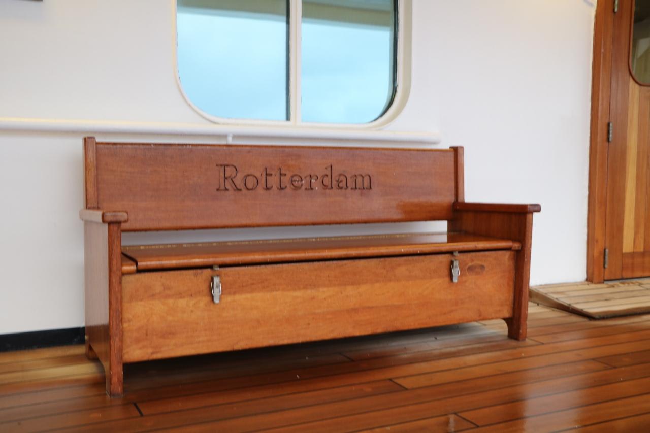 チーク材のデッキにはロッテルダムと彫り込んだ素敵な椅子が各所に配置されていて格調高い。