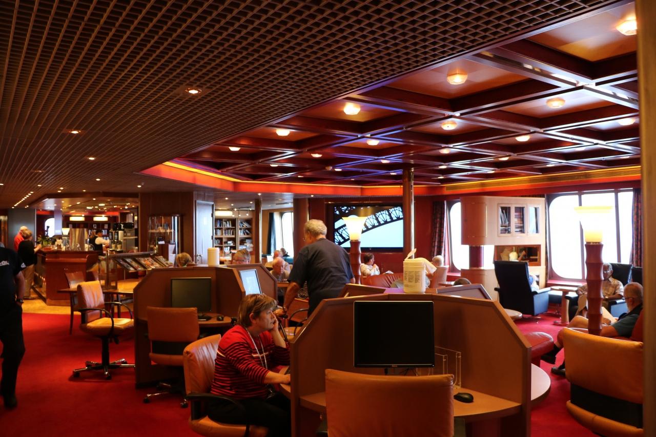 ロッテルダム船内で一番のお気に入りの場所はスポーツデッキ9階にあるCROW'S NEST(和訳すると 烏の溜まり場)室内では最高部の船首にあり、風に当たらずにゆったりと前方の景色が満喫できる。ソファに寝転ぶと下方の左右に延びる仕切り板が視界を遮り邪魔なのが不満。