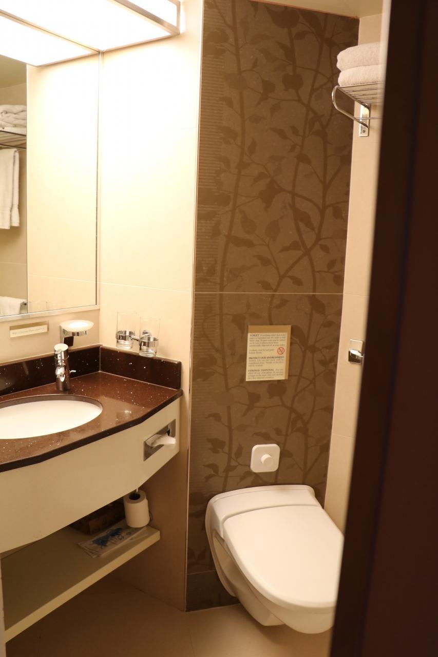 バスタブを備えた海側客室通常このクラスの船だと部屋にはシャワーとトイレのみ。HALの船には内側客室にはないバスタブが標準装備されている。