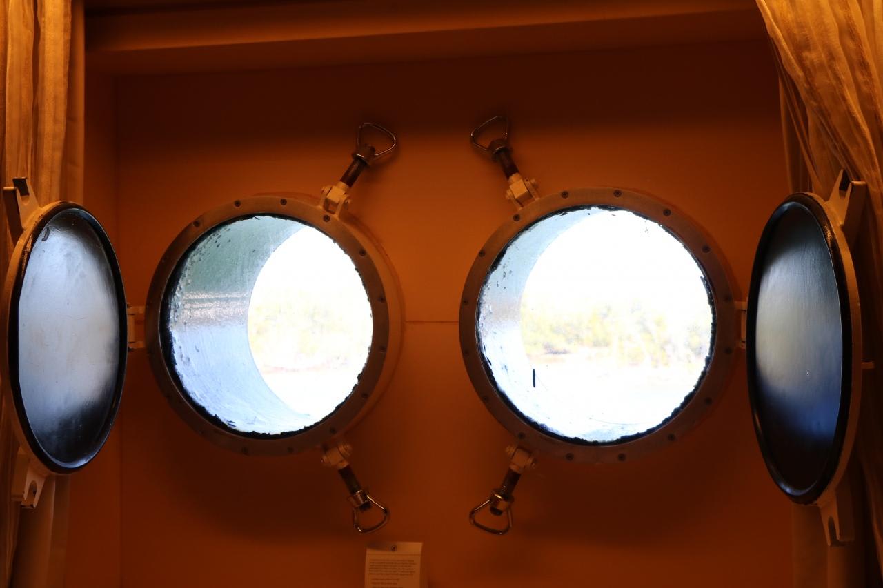 視界を遮る部屋の料金で申し込んだらワンランク上の舷窓の部屋にアップグレードされていた。舷窓は30㎝位の厚みで船体外側の厚みが想像できる。二つの丸い窓から眺める視界は遮る物はなくクラッシックで船らしい雰囲気を醸し出している。