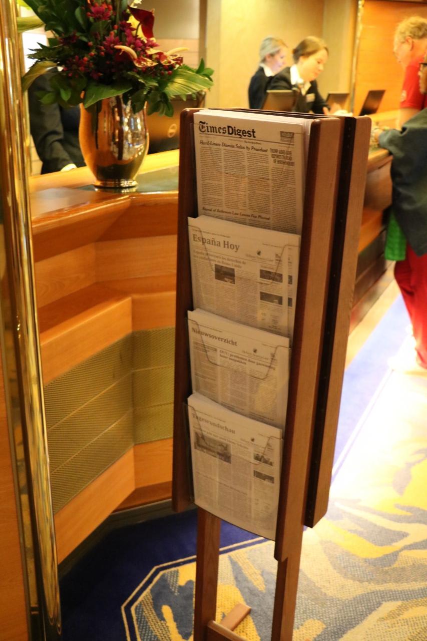 フロントの前にはアメリカ、スペイン、オランダ、カナダ、オーストライア、ドイツの新聞が毎日設置され自由に持ち帰れる。残念ながらというか当然ながら日本の新聞はなく、クルーズ中は日本で今何が起こっているのか全く分かなかった。