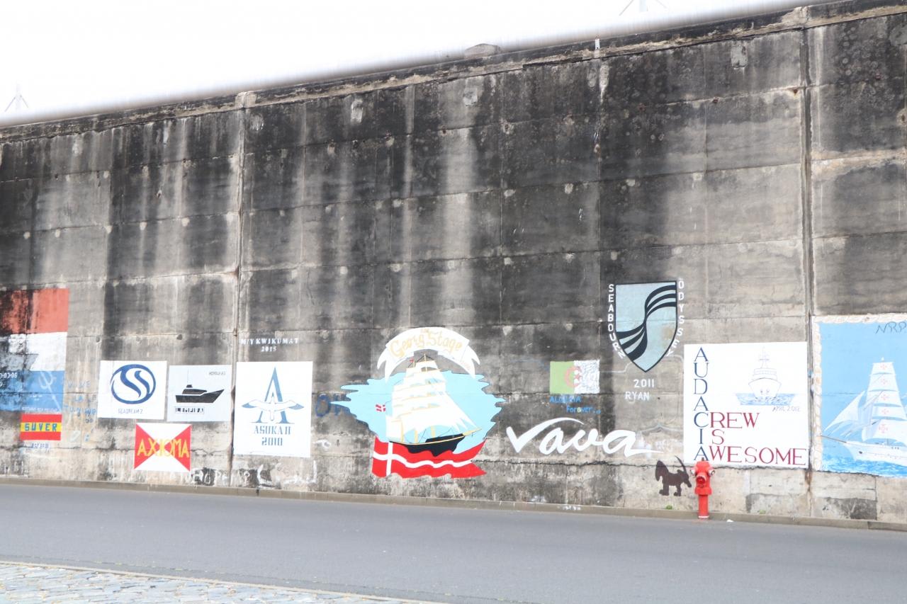 波止場の壁に描かれたフンシャルに訪れたクルーズ客船の名前とイラスト。世界一周の途上訪れた飛鳥Ⅱのイラストも。