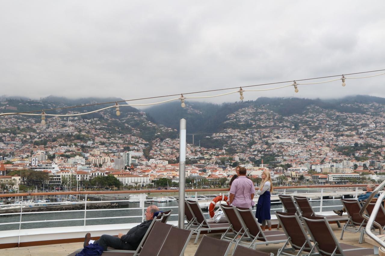 船尾のデッキでフンシャルの町を眺めながら談笑する乗船客