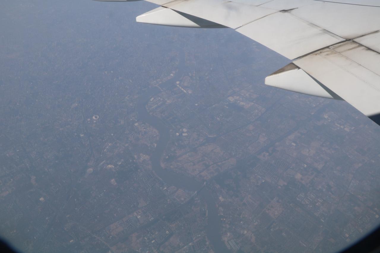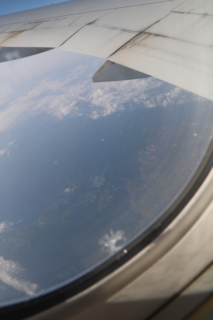 上海上空を飛行中A380と違い、本機の窓はくすんでいて下界は良く見えず不鮮明な写真になりました。
