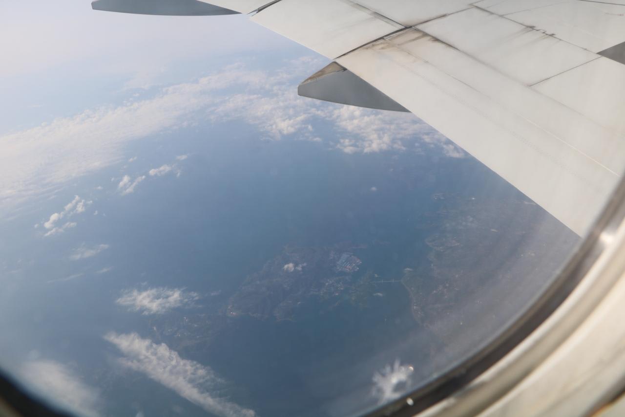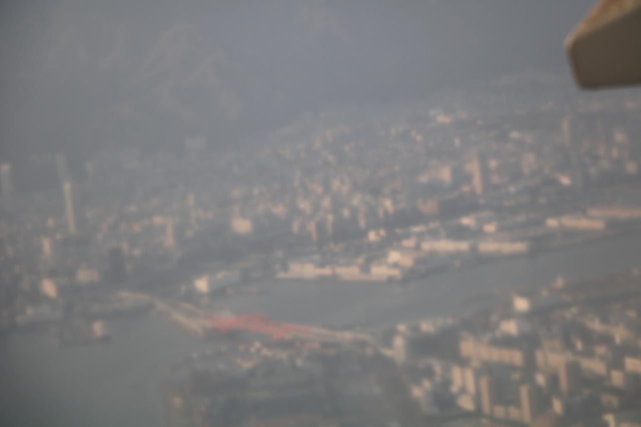 長崎の女神大橋と長崎の町が見えて来ました。長崎港の特徴ある湾や三菱重工長崎造船所を確認できました。飛行機はやっぱり速い!上海から長崎まで50分で飛んできました。