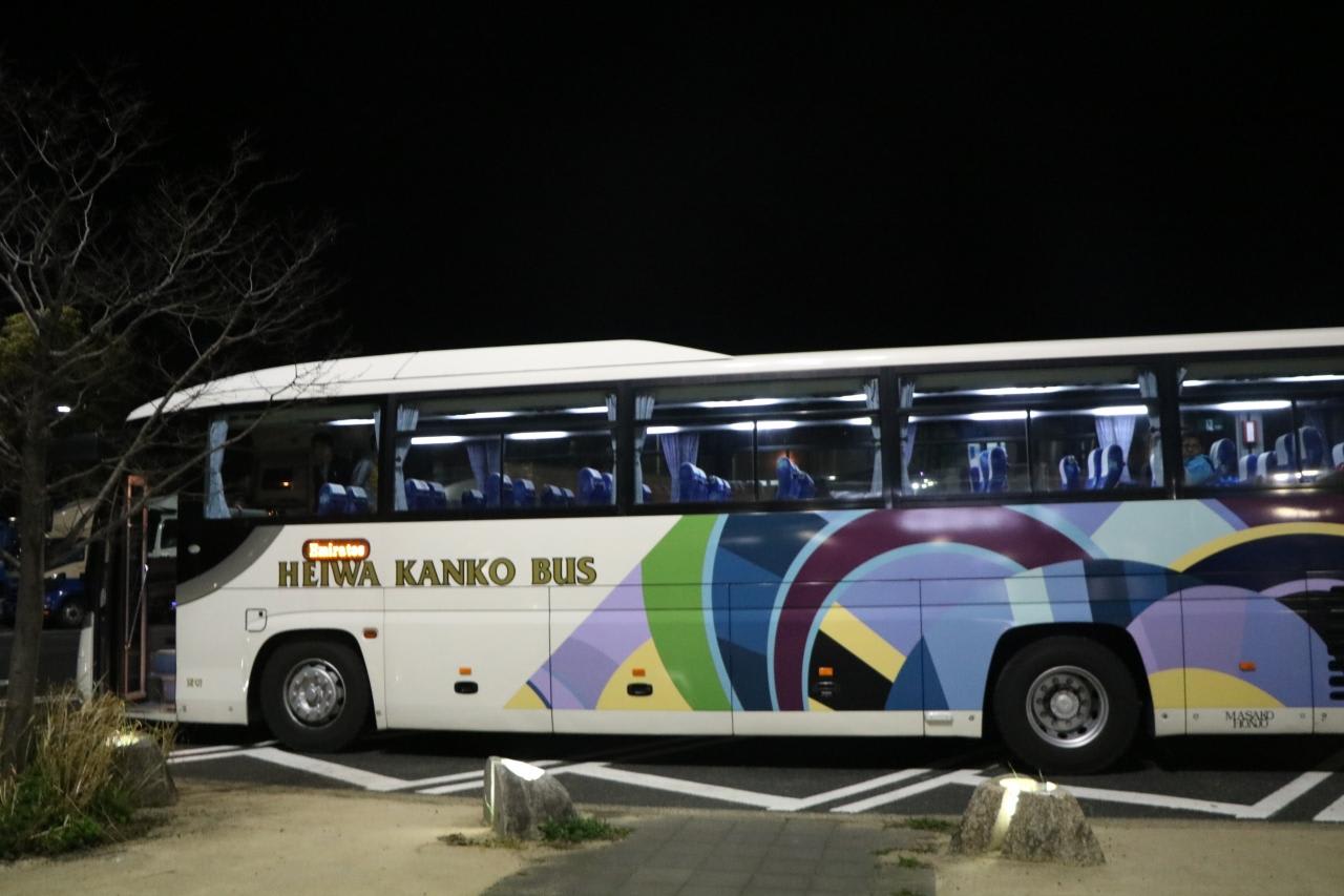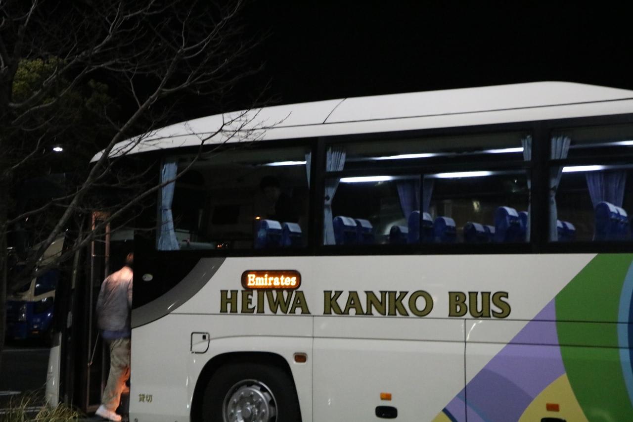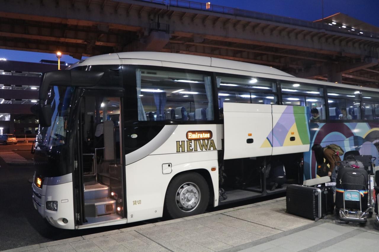 エミレーツ航空利用客のスーツケースを積込み作業バスは平和観光バスが委託されて運行しているようです。