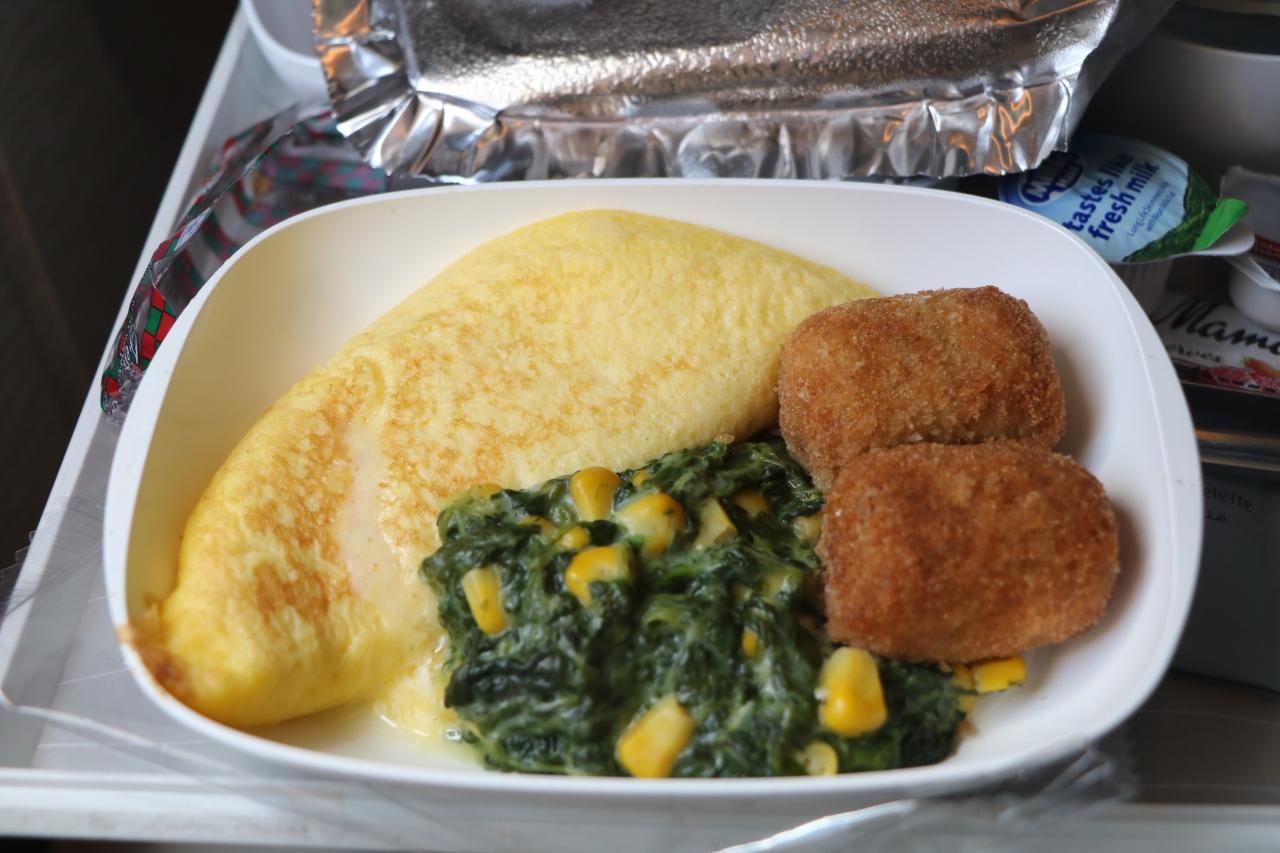 メインコース:チーズオムレツ、野菜コロッケとホウレン草のクリーム煮、スイーツコーン