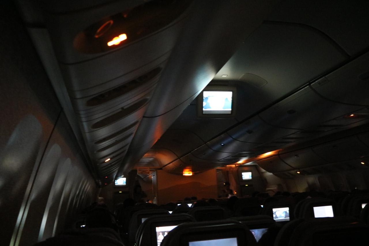 関西国際空港到着予定時間の3時間前・14時30分なのに機内はまだブラインドを下ろし、お休みモード