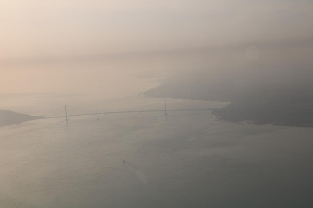 長崎から明石海峡大橋まで43分で飛んできました。淡路島と明石海峡大橋と明石が見えて来ました。やっぱり飛行機は速い!