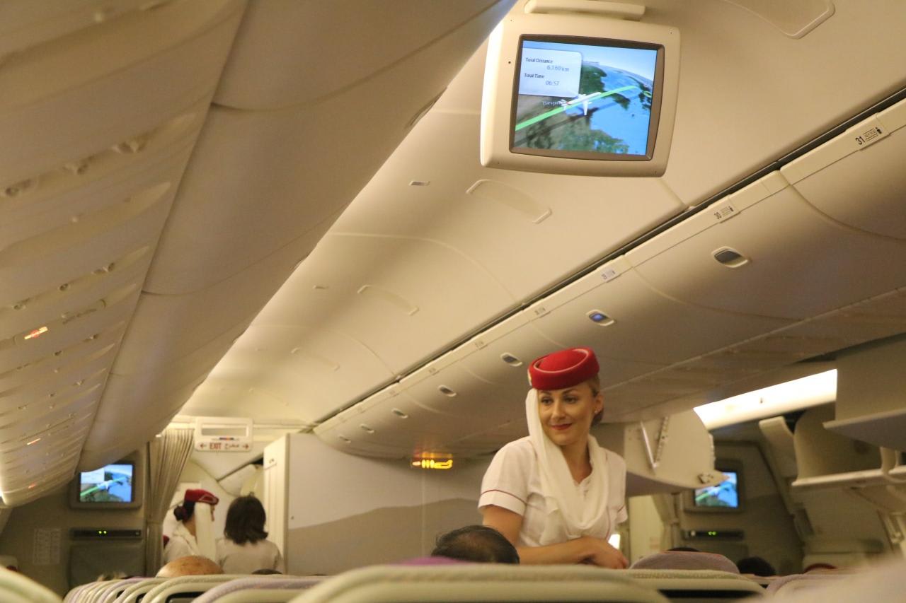 エミレーツ航空のエレガントな客室乗務員と機内風景