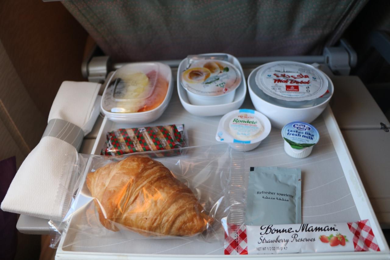 <着陸1時間半前の朝食>前菜:フレッシュフルーツパン:クロワッサン(バターとジャムを添えて)デザート:プリンエコノミー症候群防止のため、客室乗務員はミネラルウオーターを盛んに配給し水分摂取を勧めていました。