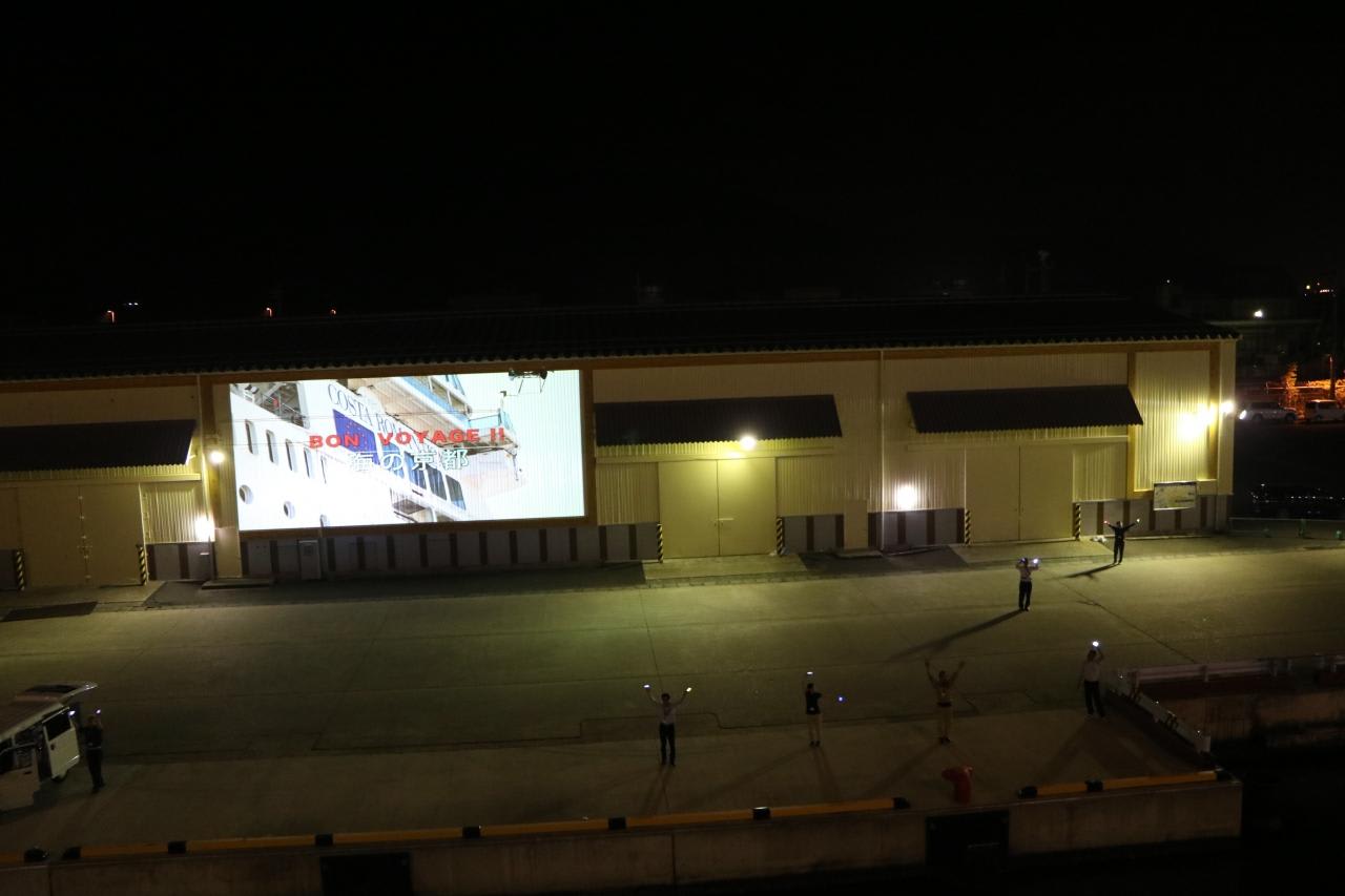 倉庫の壁に映し出された「BON VOYAGE!!」のスクリーン