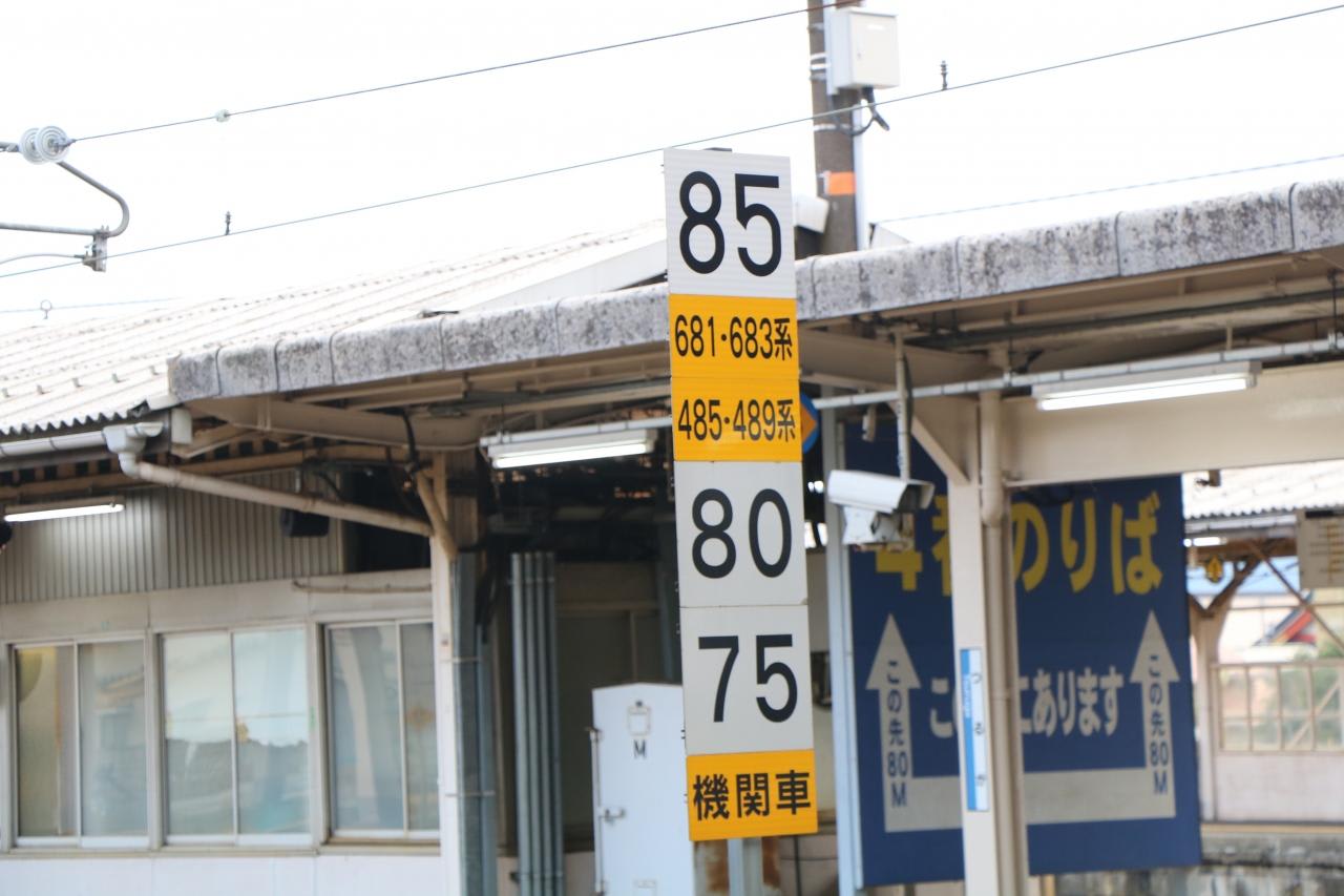 敦賀駅構内の電車と機関車別に制限速度が掲げられているユニークな線路標識