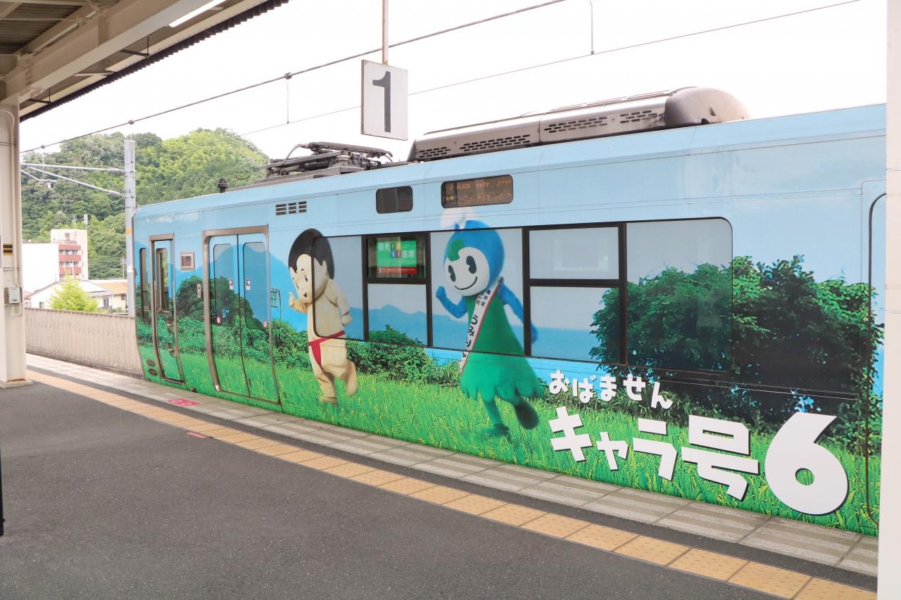 ラッピング列車は小浜線の敦賀⇔東舞鶴を運行するうちの1車両。若狭地方の海山を背景に、ツヌガ君(敦賀市)、へしこちゃん(美浜町)、わかさ梅ぼう(若狭町)、さばトラななちゃん(小浜市)、うみりん(おおい町)、赤ふん坊や(高浜町)が走る姿が描かれている。