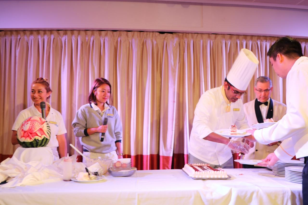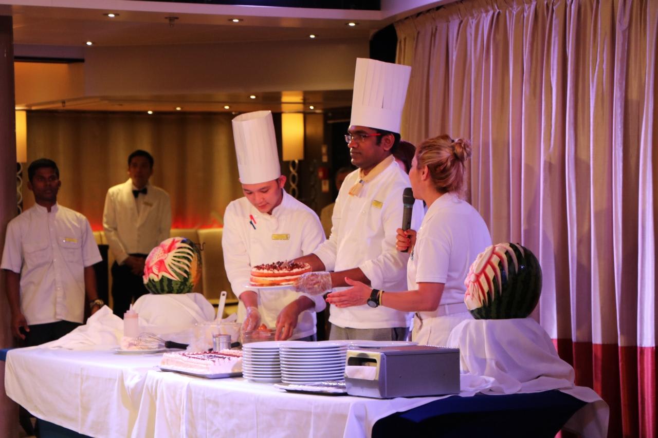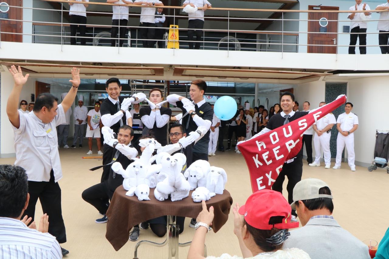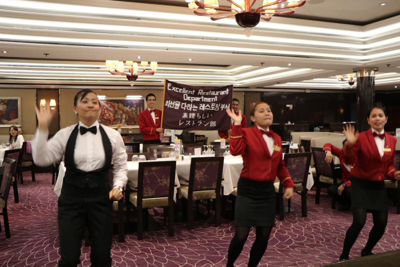 メインダイニングでは毎晩の様にレストランのスタッフが歌や踊りを披露し、ムードを盛り上げる。フィリピン人のウエイターはホスピタリティたっぷりで歌も踊りも上手く大活躍。