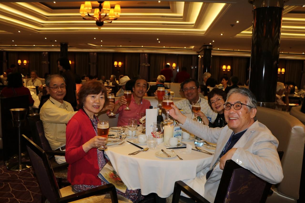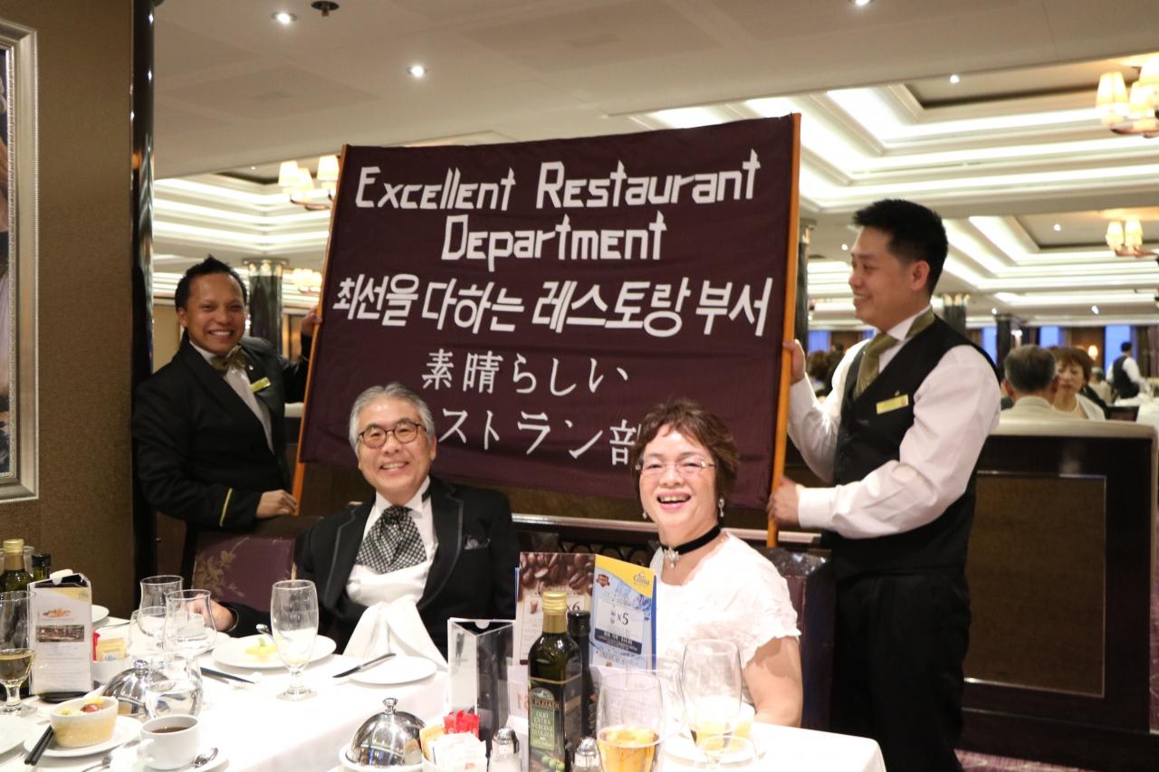 今日はSさんの古希の誕生日。今宵はフォーマルナイト。船上で誕生日を迎えられるような目出度いことは滅多にないと愛妻がバーズデイケーキを事前に予約し、ハッピーバースデイの音楽と共に皆さんから祝福される事を期待していました。ところがレストラン側の不手際でバースデイケーキが提供されることはなく、幻のバースデイパーティとなりました。(日本の客船ではありえない出来事)やむなくレストラン部の旗を持って来させて記念写真を撮りました。船側の当日の誠意のない対応に不満を残すと共に本船の弱点を露呈。笑って済ませるSさんは立派!
