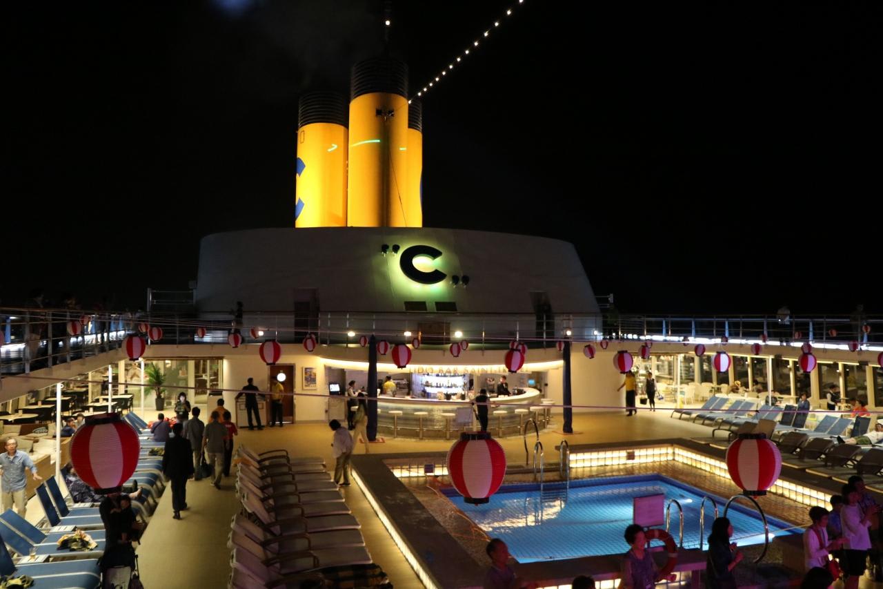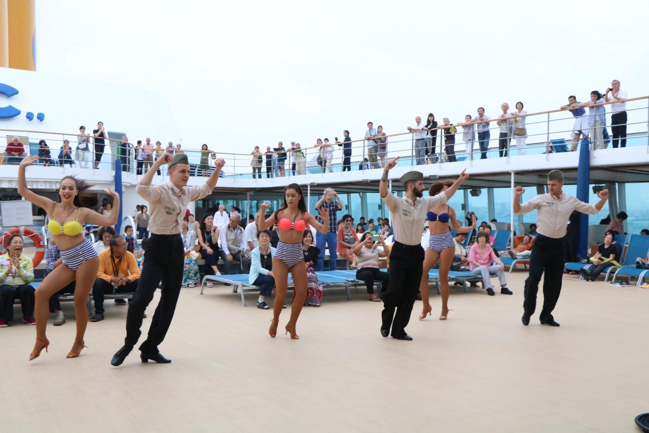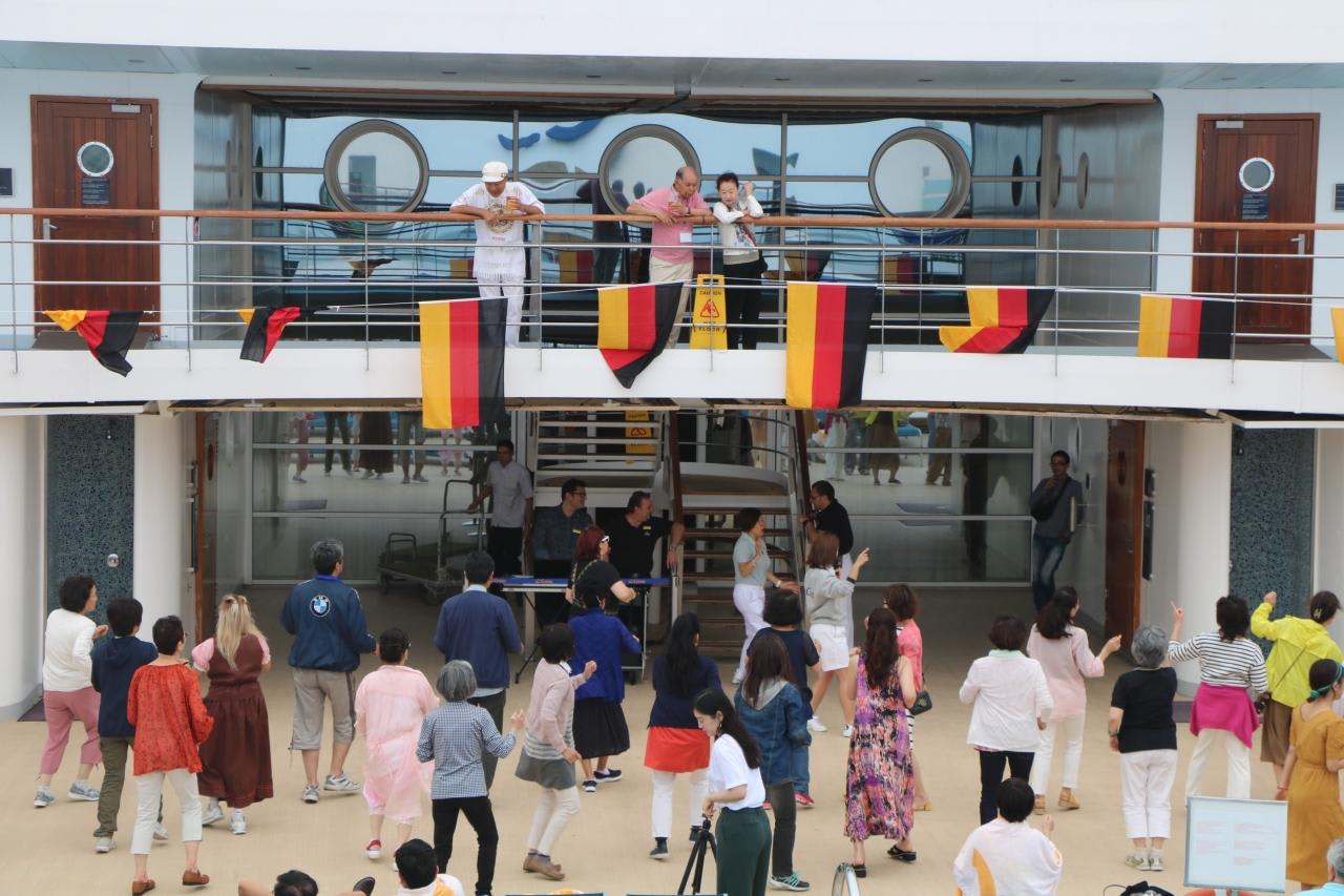 今回のコスタネオロマンチカはラテン音楽調のクルーズで、釜山、博多、舞鶴、金沢で乗下船できるインターポーティングシステムを導入しており、一斉に乗下船するクルーズのようにwelcomeと good-byeのセレモニーを大々的にする訳にもいきません。各港で乗下船する人達にその気分を味わってもらうために本船では実に上手くコスタのお家芸のお祭り騒ぎで盛り上げていました。