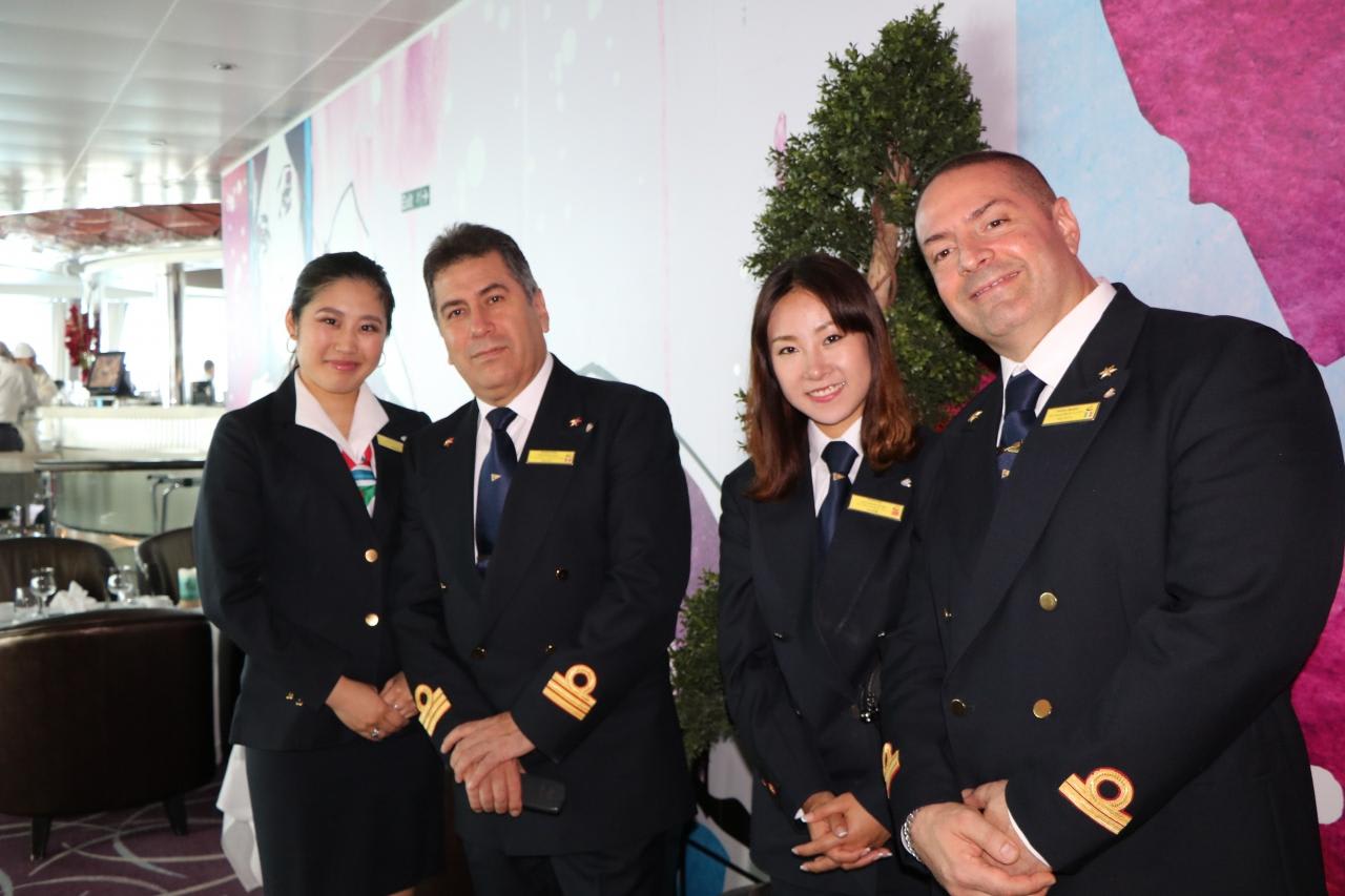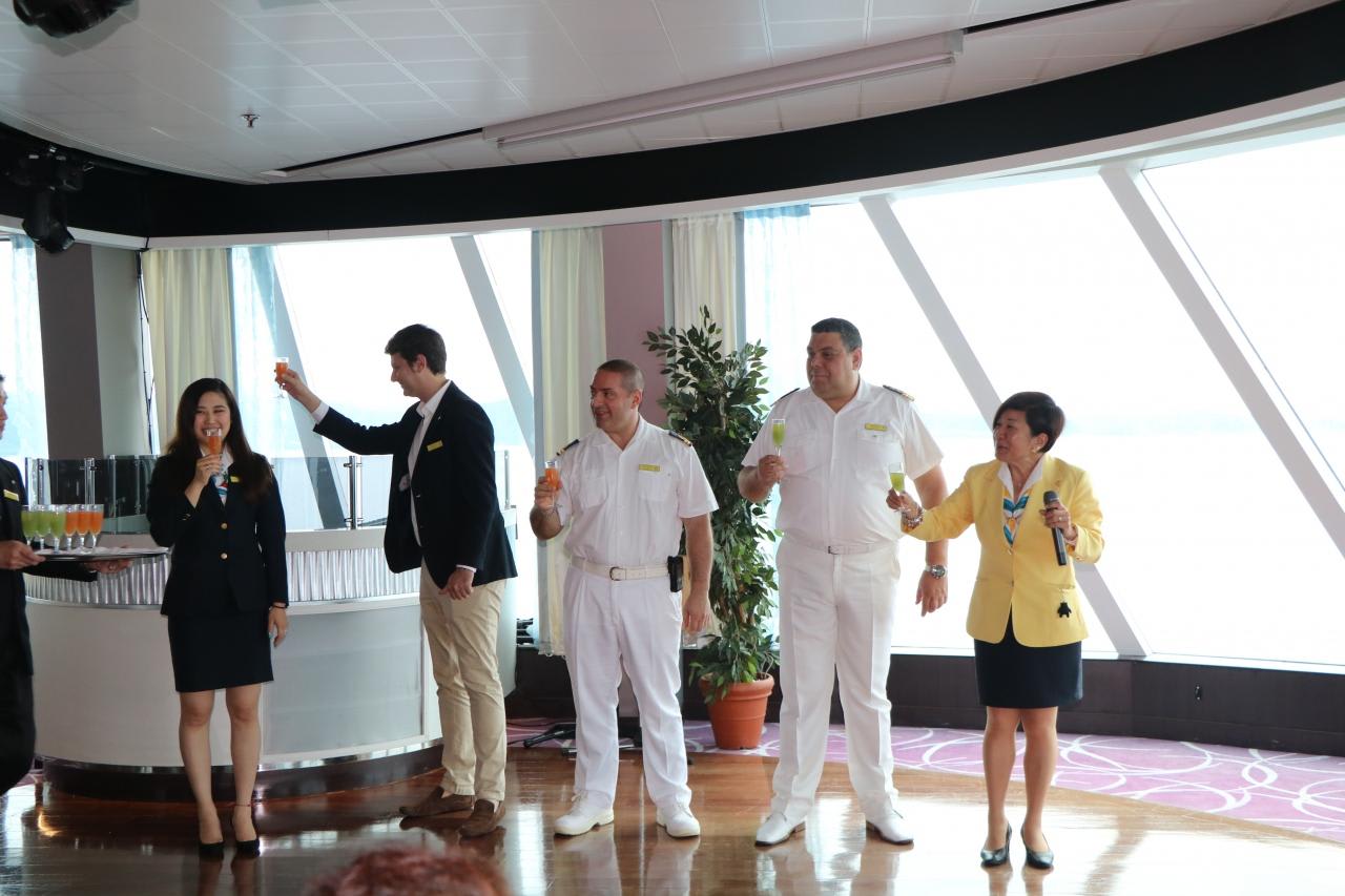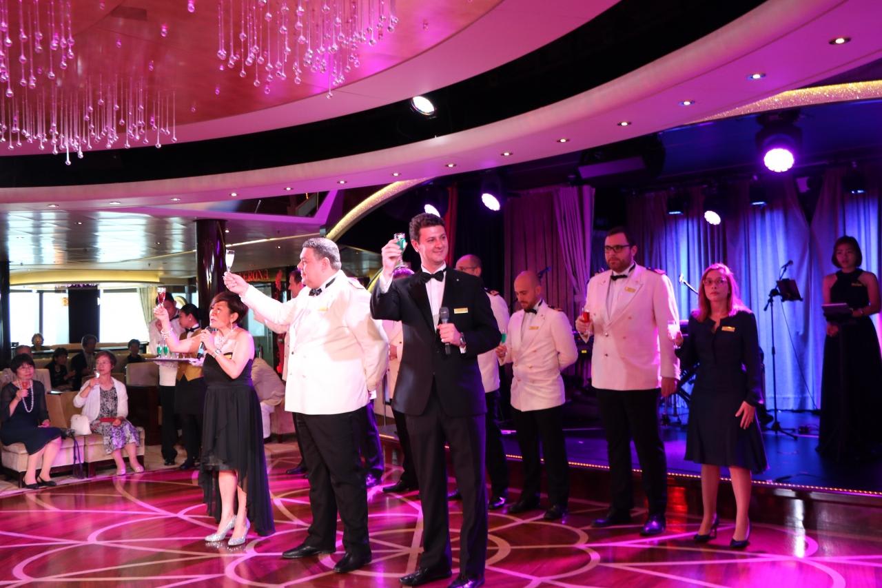 上級オフィサーが勢揃いし乾杯!昨年のコスタビクトリアの時から継続して乗船しているクルーディレクターGIOVANNIと通訳のノリコさんのコンビは絶妙。コスタ日本発着クルーズには不可欠の申し分のない司会ぶりを発揮していました。